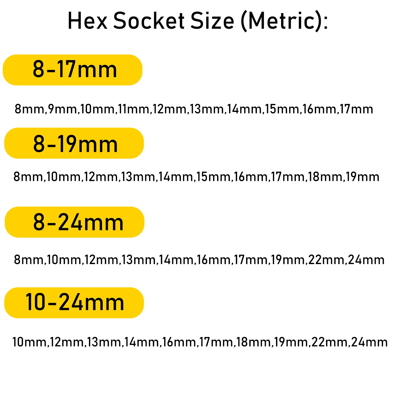 8mm,10mm,12mm,13mm,14mm,16mm,17mm,19mm,22mm,24mm