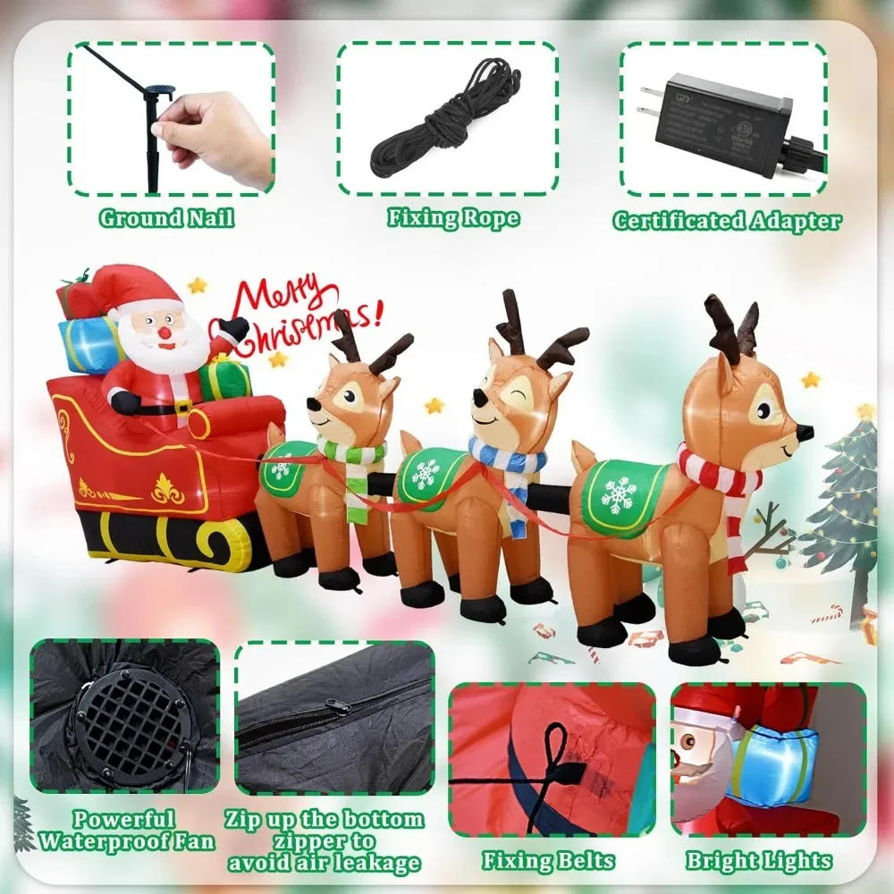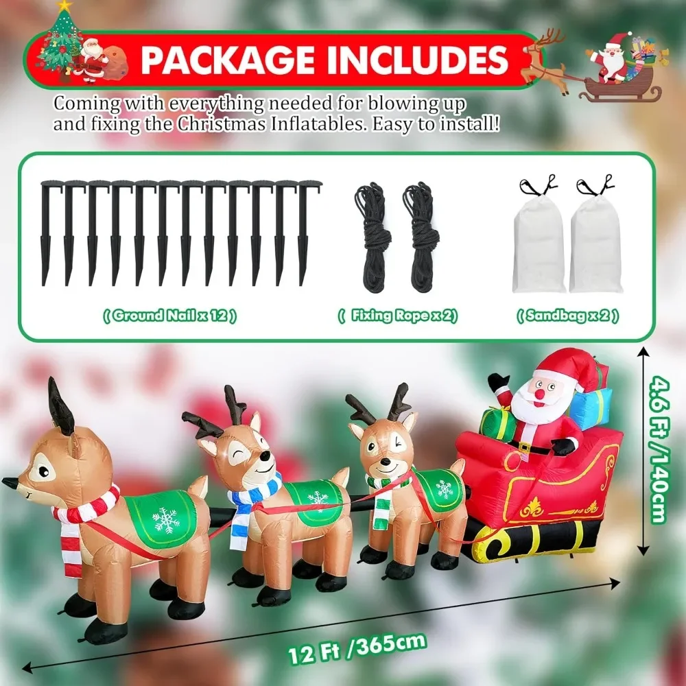 12 FT Long & Large Inflatable Santa Claus on Sleigh with 3 Reindeer: It is a special Christmas inflatable for outdoor decoration to create a strong Christmas atmosphere, such as home, mall, garden, yard and lawn. The Santa Clause on sleigh with waving hand, and 3 Reindeer with cute looks, help to welcome your guest and expresses wonderful Blessings to them in the coming new year