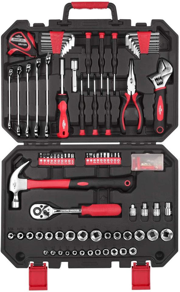 - COMPREHENSIVE TOOL SET- 198-piece essential tools are in one box: claw hammer screwdriver set pliers wire stripper combination wrenches ratchet wrench sockets hex keys mini saw tape measure and driver bits etc. All tools meet or exceed ANSI standard.