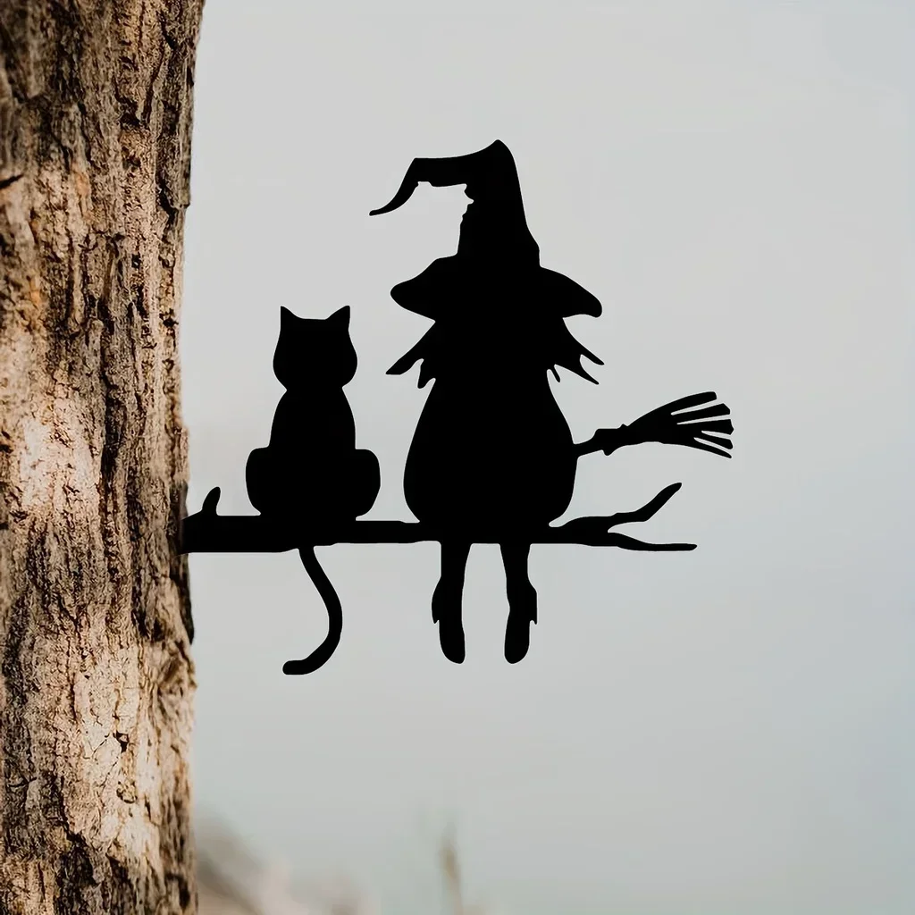 1pc Iron Silhouette Cute Witch And Cat Garden Stake On The Branch Yard Art Decor, Tree Stump Plug-in, For Garden Lawn Courtyard