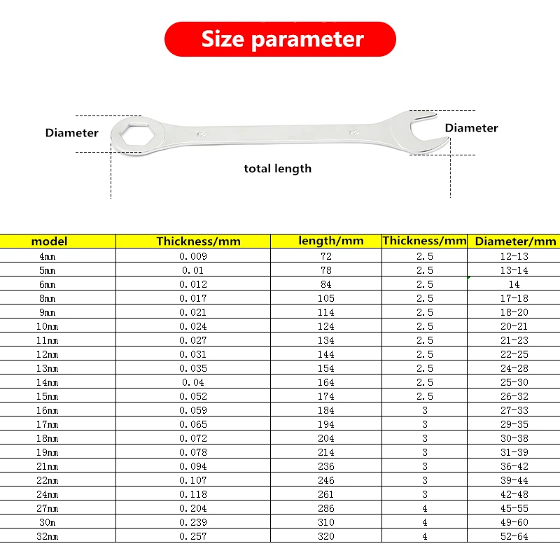16mm, 17mm, 18mm, 19mm, 21mm, 22mm, 24mm, 27mm, 8mm, 9mm, 10mm, 11mm, 12mm, 13mm, 14mm, 15mm, 4mm, 5mm, 6mm, 30mm, 32mm
