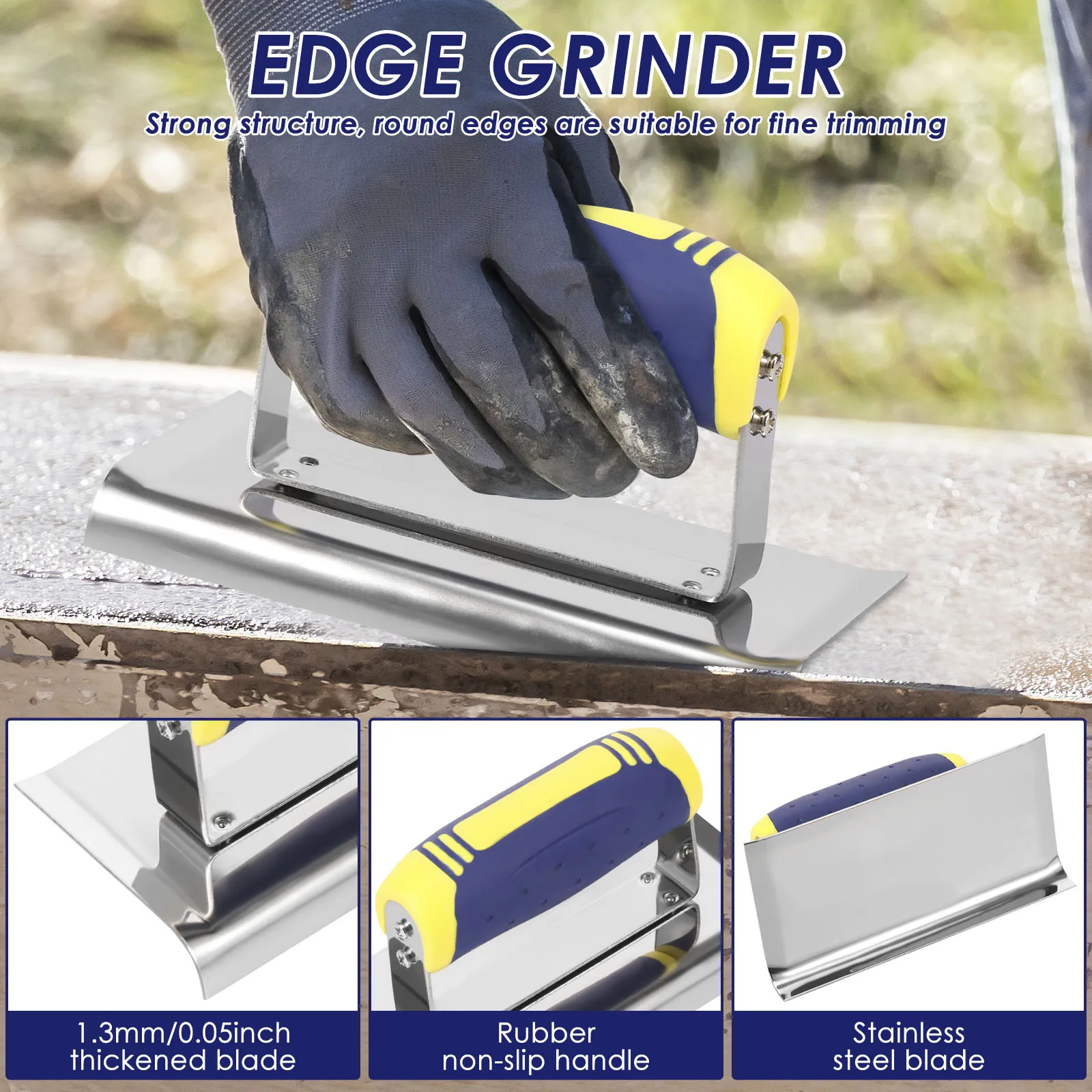 Purpose : The edger features 1.3 mm thickened stainless steel blade , wear resistant and pressure resistant , with rounded edges for precise trimming . The groover uses 0.7 mm polished stainless steel plate , smooth and rustproof . The flat finishing trowel adopts stainless steel and aluminum handle , suitable for large area leveling tasks