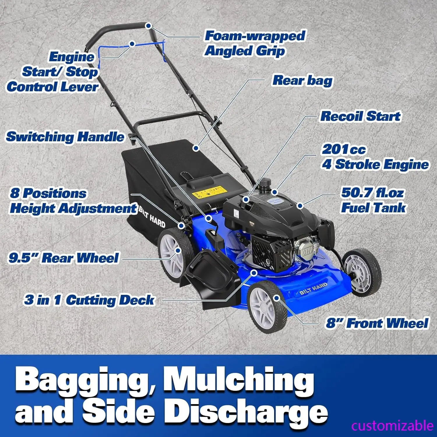 21 Inch Lawn Mower Gas Powered, 4-Cycle 201cc Engine, 3-in-1 Push Lawnmower with Bagging, Mulching & Side Discharge, Adjustable 8-Positions Cutting Height, Easy