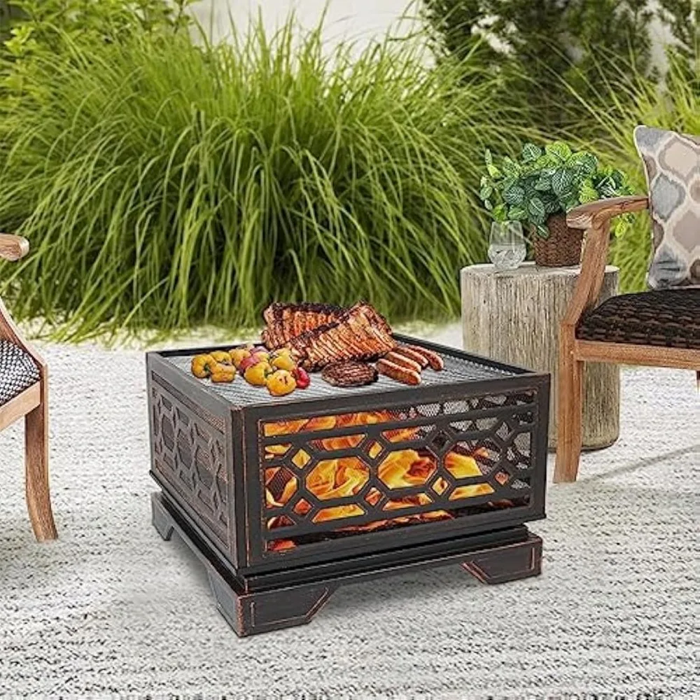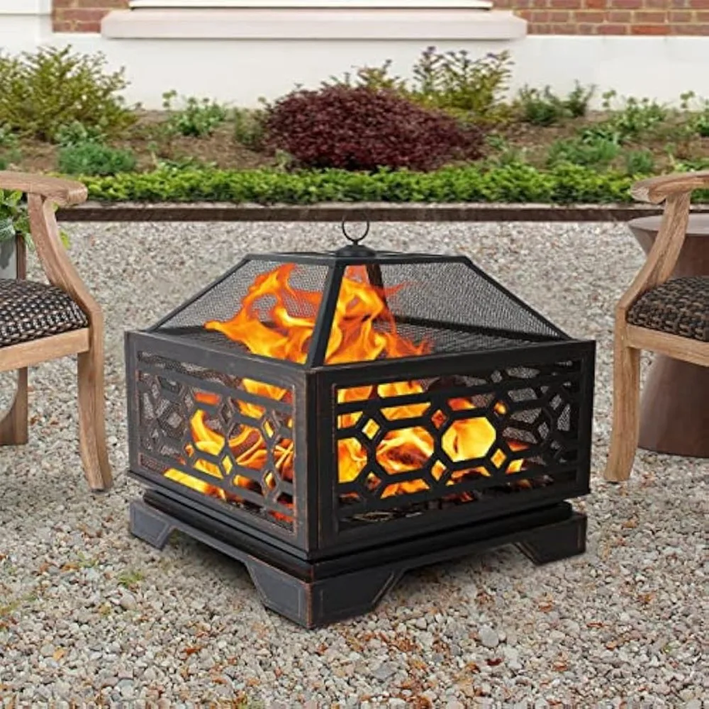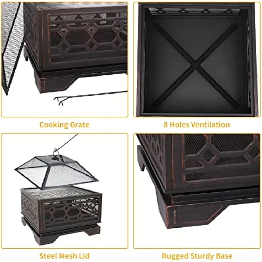 • Cooking Grate & Mesh Screen: This wood fire pit comes with a square cooking grate that fit the size, a steel mesh screen that effectively prevent sparks, embers and debris from flying out, and a poker allows you to move wood or charcoal and safely lift up the mesh screen.