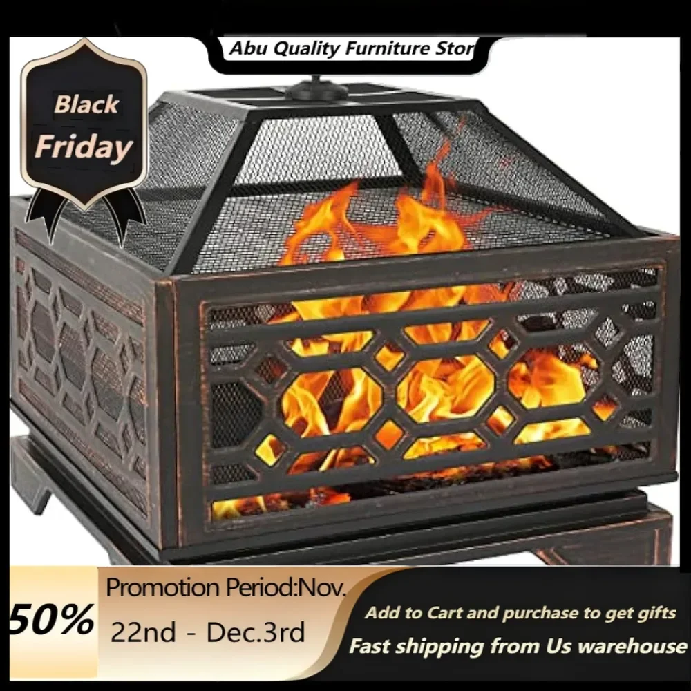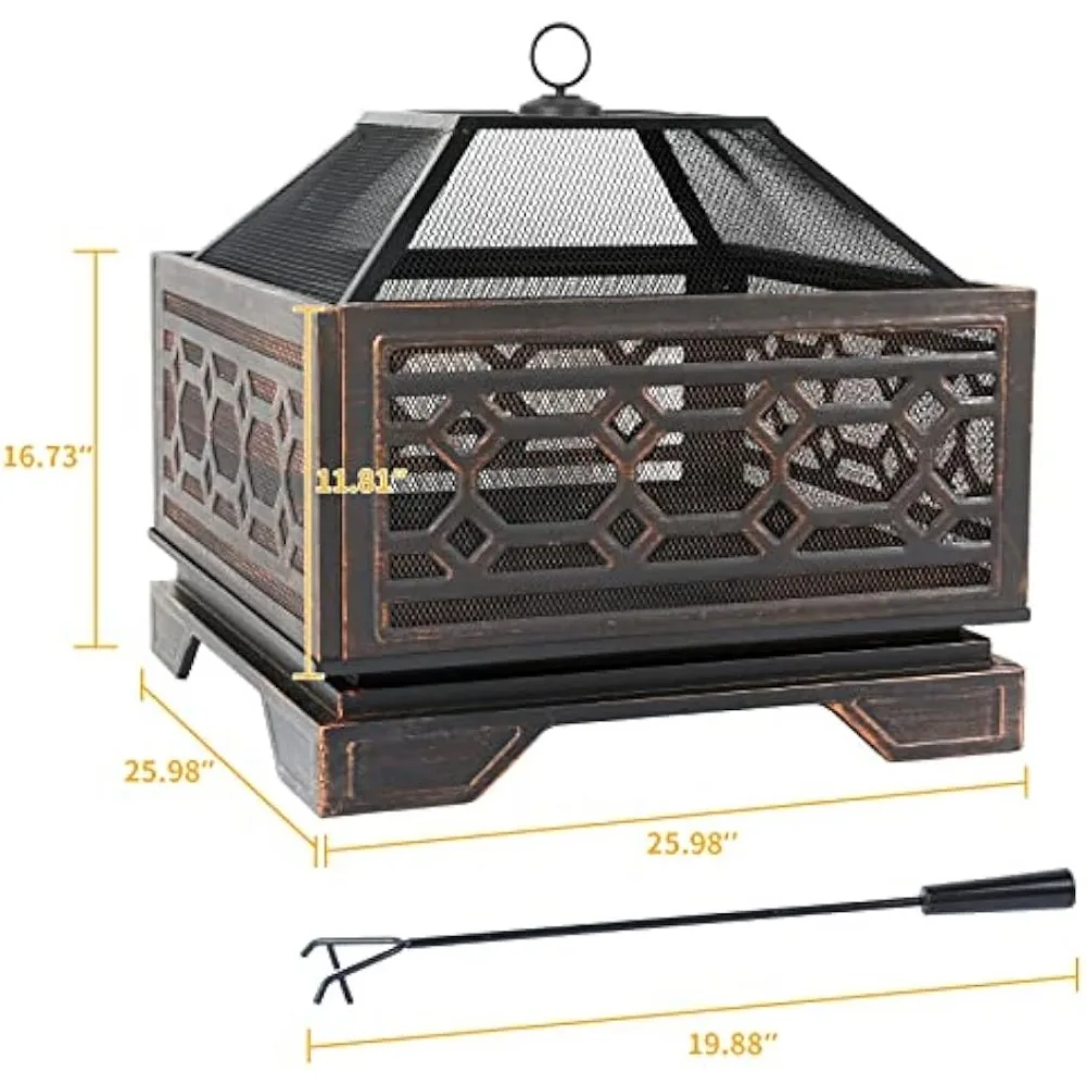 26 Inch Outdoor Fire Pit Square Extra Deep Wood Burning Firepits Large Bonfire with Cooking Grate & Poker for Outside.