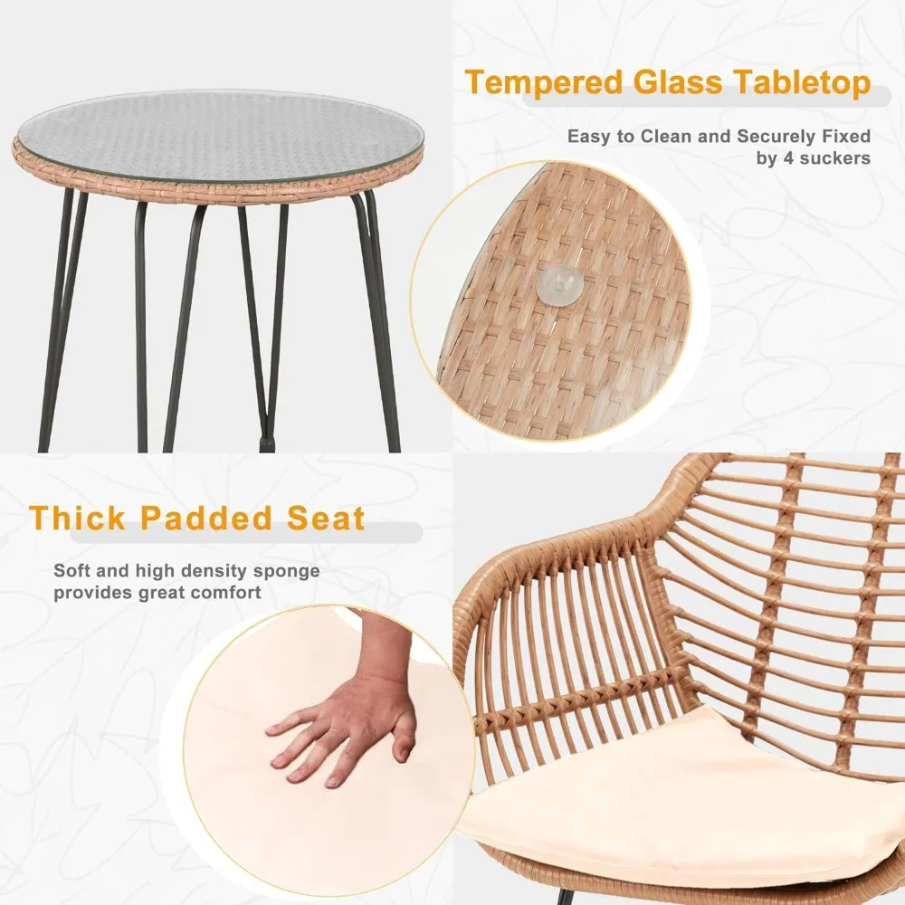 - PREMIUM MATERIAL:Our outdoor bistro set with lovely PE wicker-wrapped design, which not only has a sleek and minimalist appearance, but also a stable structure. Ideal modern decoration for your outdoor space. patio bistro set includes 2 wicker chairs, water-resistant cushions, and 1 round side table with a tempered glass top.