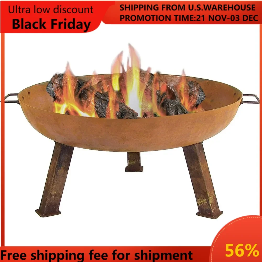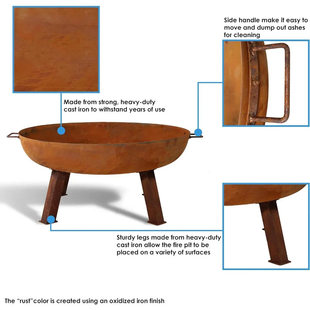 - Heavy-duty construction: The outdoor fire pit bowl is made from a sturdy and durable cast iron material that is oxidized for a contemporary rustic look that will complement your outdoor decor for years to come. This unique finish is formed when metal is exposed to water and oxygen. Because of this, the color may continue to change over time. To limit color change, keep this product covered when not in use.