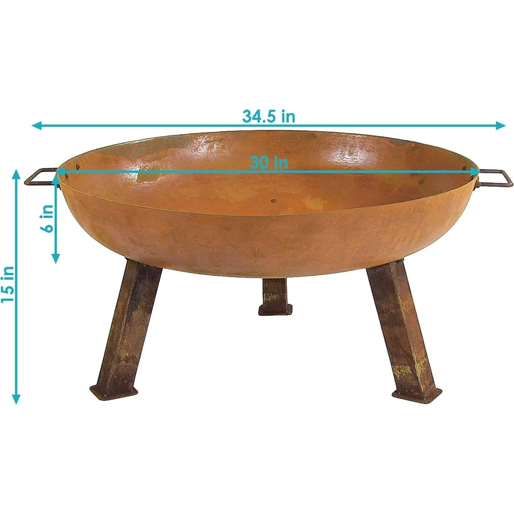 - Great size for gatherings: This cast iron fire pit measures 30″ in diameter x 15″ H overall and weighs 25 lbs. The fire bowl measures 30″ diameter x 6″ H. From handle to handle, the round fire bowl measures 34.5″ W, making it the ideal size to gather around with family and friends for a memorable night.