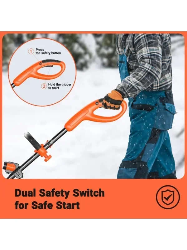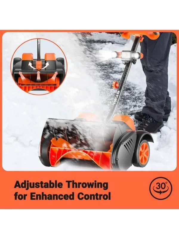 - ADJUSTABLE PLATE & USER-FRIENDLY – Unlike traditional snow blowers, our snow shovel battery powered requires no complicated assembly. Just simply press the safety switch and hold the trigger to start your snow removal work. Additionally, our battery powered snow shovel is equipped with a rechargeable LED light and a 30-degree adjustable plate, allowing you to handle snow effortlessly, whether day or night.