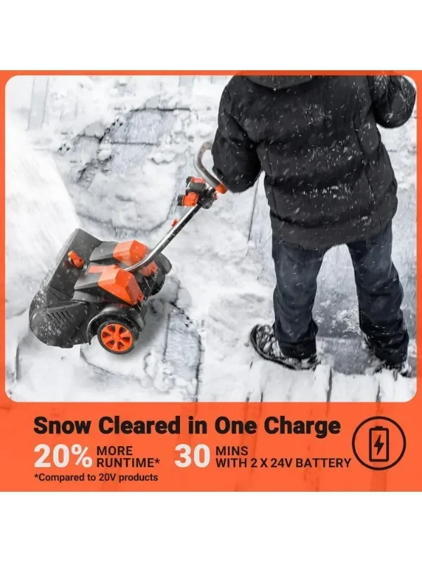 - HIGH EFFICIENCY & HIGH MANEUVERABILITY – This cordless snow shovel is equipped with a powerful 48V brushless motor, powered by two 24V rechargeable lithium battery packs, offering a maximum runtime of 30 minutes. As a hand held snow shovel, we have equipped it with specialized snow wheels to ensure high maneuverability, making your snow removal work quick and manageable.