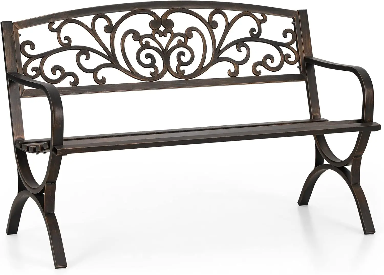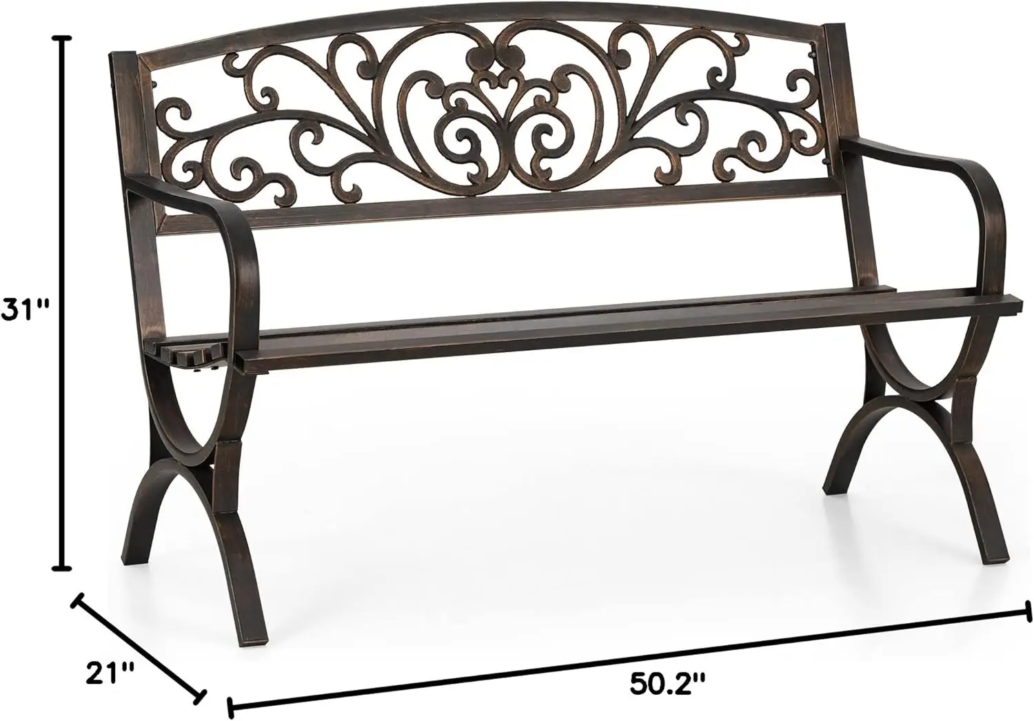 This outdoor bench is made of powder coated metal frame & cast iron backrest, weather-resistant and rust-proof, suitable for outdoor use. The bronze color reveals a classic atmosphere, and is hand-painted to create the most natural and simple appearance.