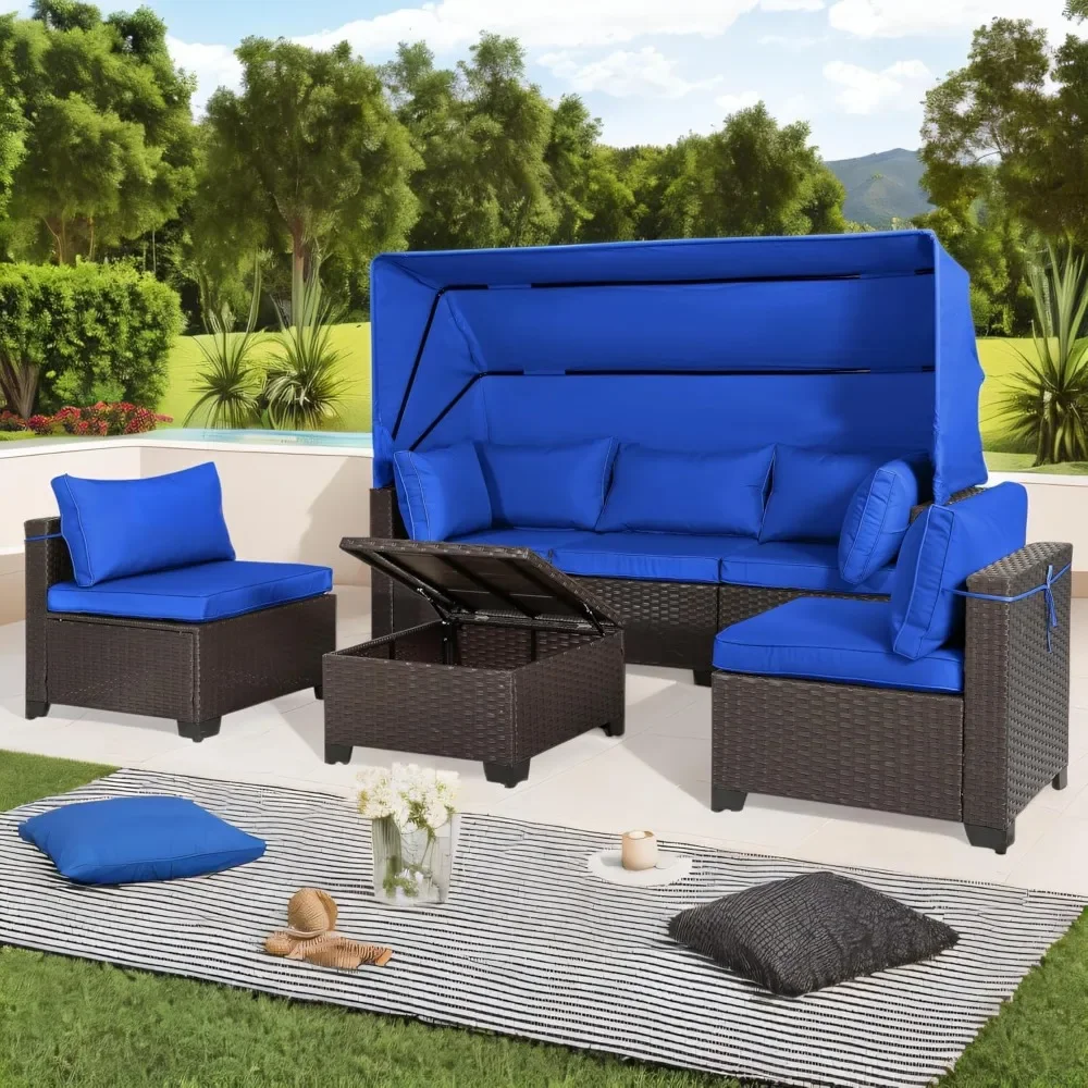 Indulge in luxury and relaxation with the 6-Piece Daybed with Retractable Canopy. This patio furniture set includes a sofa with 1 middle chair and 2 corner chairs, 2 single middle chairs, 1 end table, 6 back cushions, and 6 seat cushions.