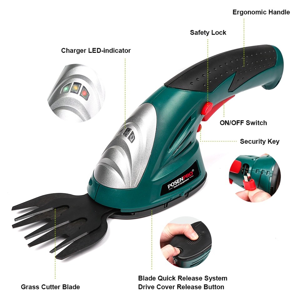 The POSENPRO PGHT7.2 2-in-1 grass shear hedger boasts a 7.2-volt long-life lithium-ion battery for hassle-free,cordless operation. Power up instantly with the push of a button and start shearing or shrubbing with cord-free convenience. Rechargeable battery power makes hedger maintenance-free, so you’ll be able to get the job done without having to worry about gas, oil, costly seasonal tune-ups, or toxic hydrocarbon emissions.