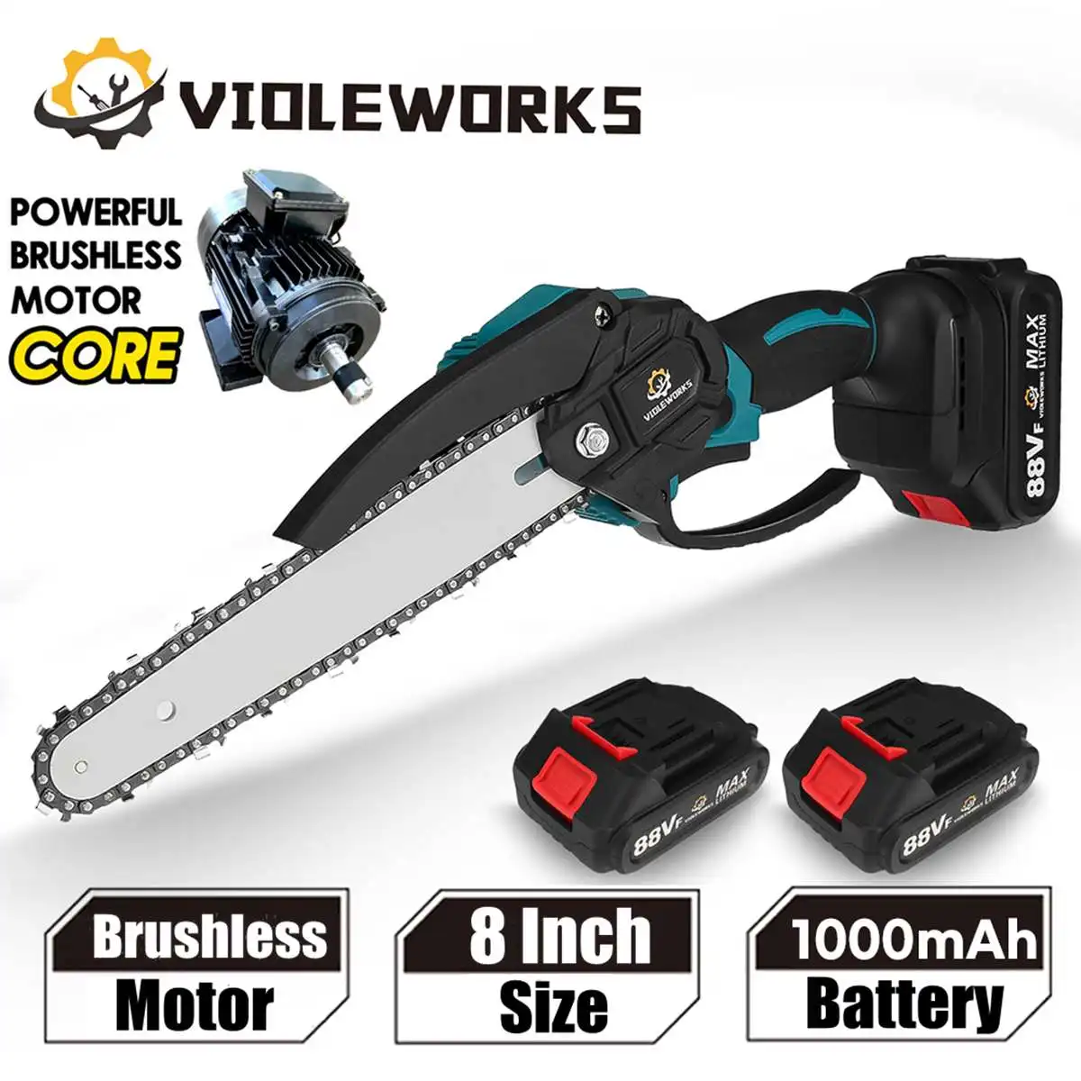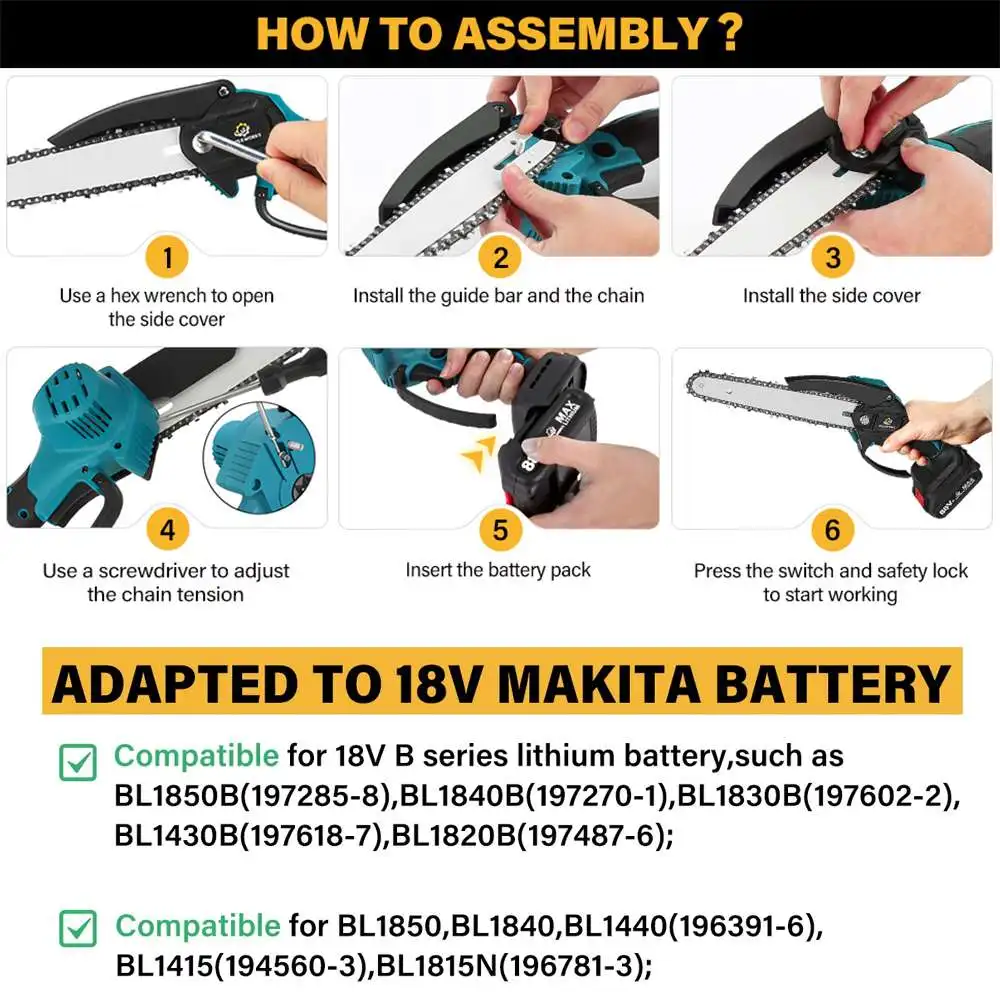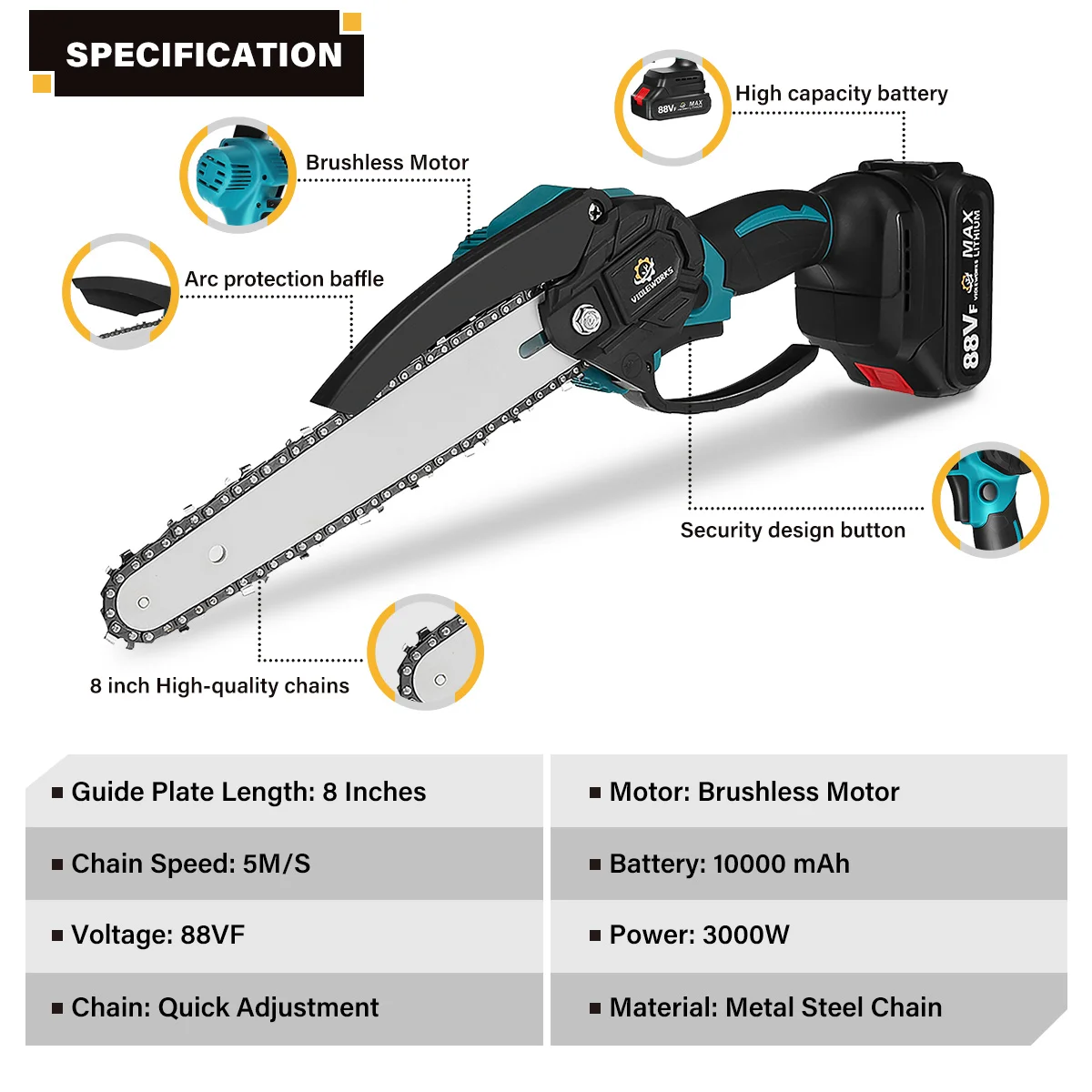 – Sharp & Strong Chain:High quality alloy chain, wear-resistant and durable, fast and smooth sawing without jamming.- Wide Application:This electric chainsaw has a wide range of uses, can be used for Forest cutting, cutting wood, pruning branches and so on.