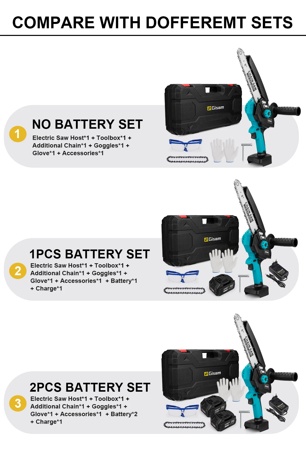【Super Power】The battery-powered chain saw is powered by 2pcs/1pc(It depends on your choice) rechargeable battery, allowing you to have one charging while the other is in use. The 2.5-inch wood can be cut up to 98 times, and the 4-inch round wood can be cut 80 times. Easy to do all cutting work!