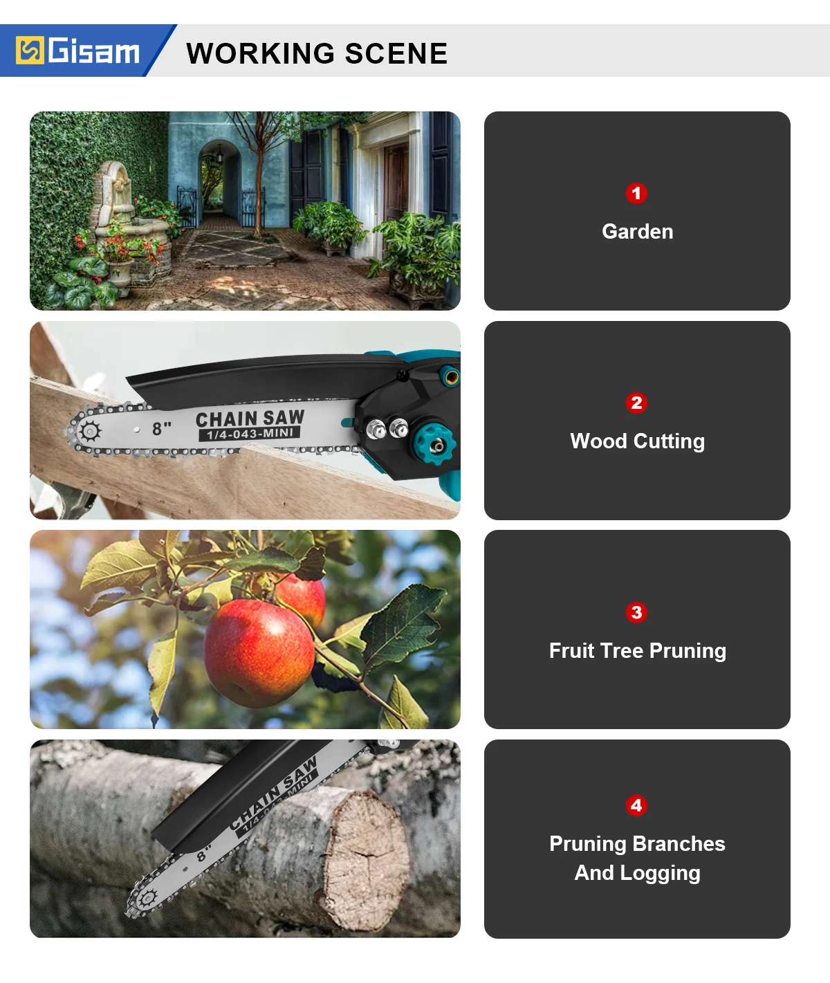 【Portable Handheld Chainsaw】Upgraded 8" chain with cutting speed up to 25 ft/sec, this thing cuts right through 0-6" branches and unwanted tree limbs like butter, cutting 8" wood with ease. Even though it's an 8-inch Chainsaw, it just weighs 3.2lb, and adult men can handle it with one hand easily. One of the best points is while it produces a clean cut on big-inch wood, it's not too noisy, not like a gas chainsaw.