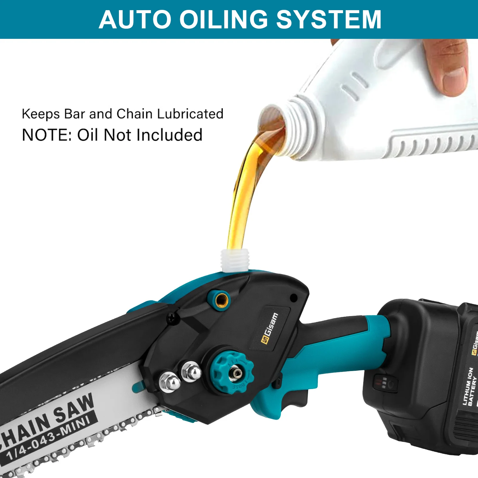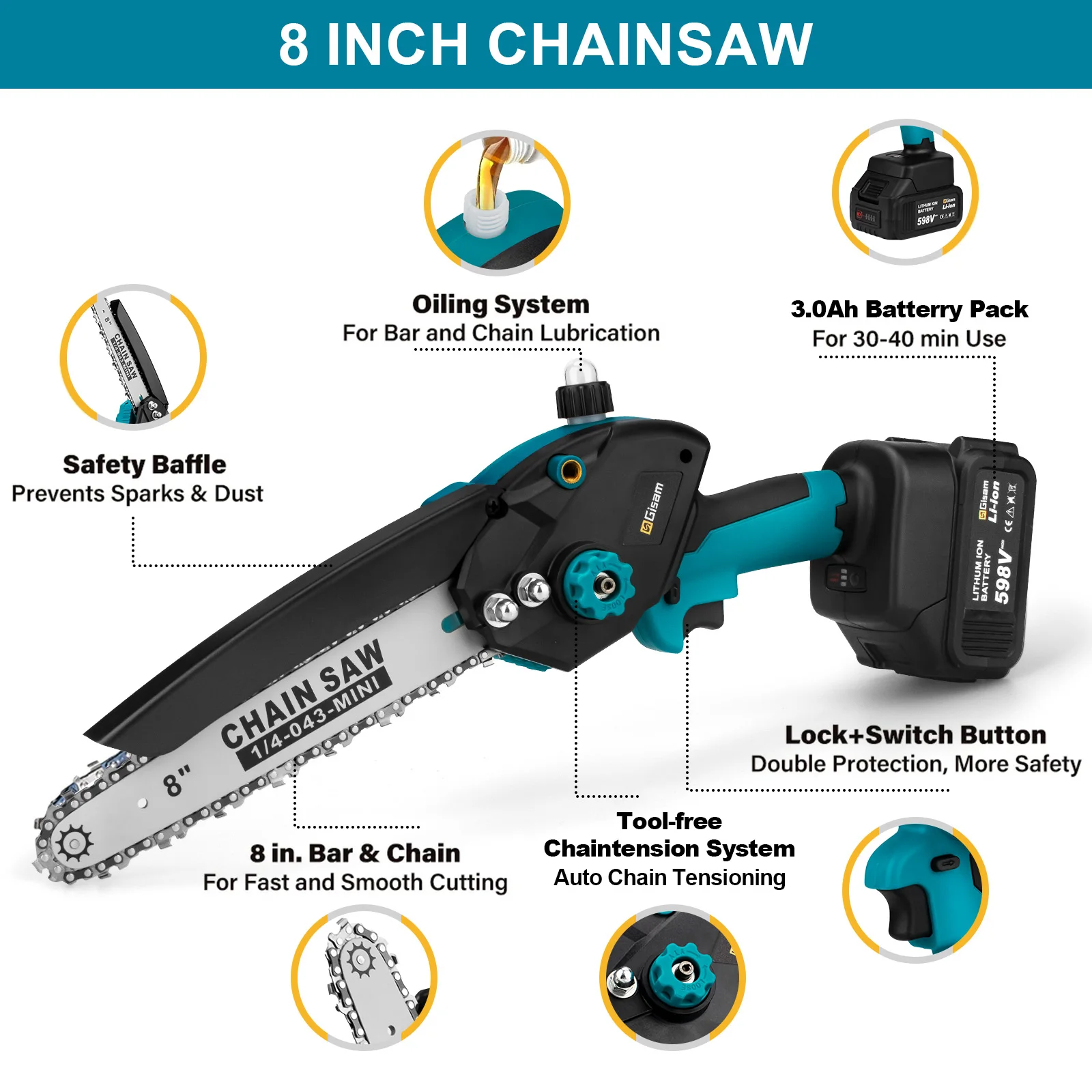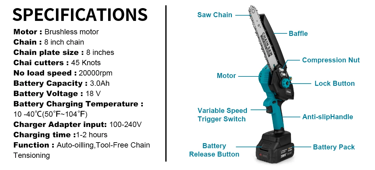 【Auto-oilling and TOOL-FREE CHAIN TENSIONING】 8-inch mini chainsaw is adopted with an advanced auto-oiling system and toolless tensioning technology. The 1.6oz sized lube oil tank lessens the frequency of oil-filling, while the tension of the chain can be adjusted by just turning the knob.