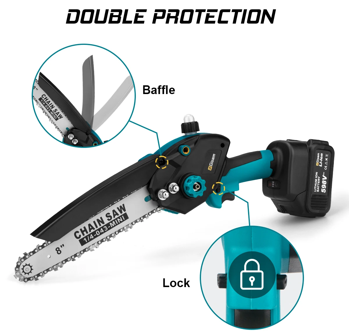 【Triplex Safety Protection】Small chainsaw features a safe lock-off button, a 90°rotatable guard baffle, plus rubberized and ergonomic grips for user safety. One thing needs your attention: the motor won't break or stop turning after releasing the trigger immediately, please do not touch the chain with your hands at this time.