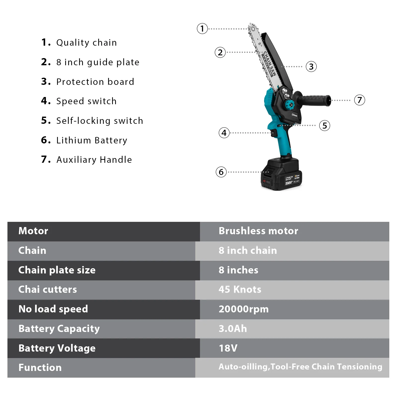 【Brushless Cordless Chainsaw】Unlike most 4-inch 6-inch small mini chainsaws on the market, this one has a powerful brushless motor inside. It provides 50% more efficiency than a traditional brushed motor, giving this portable chainsaw a longer run time and powerful motor life.