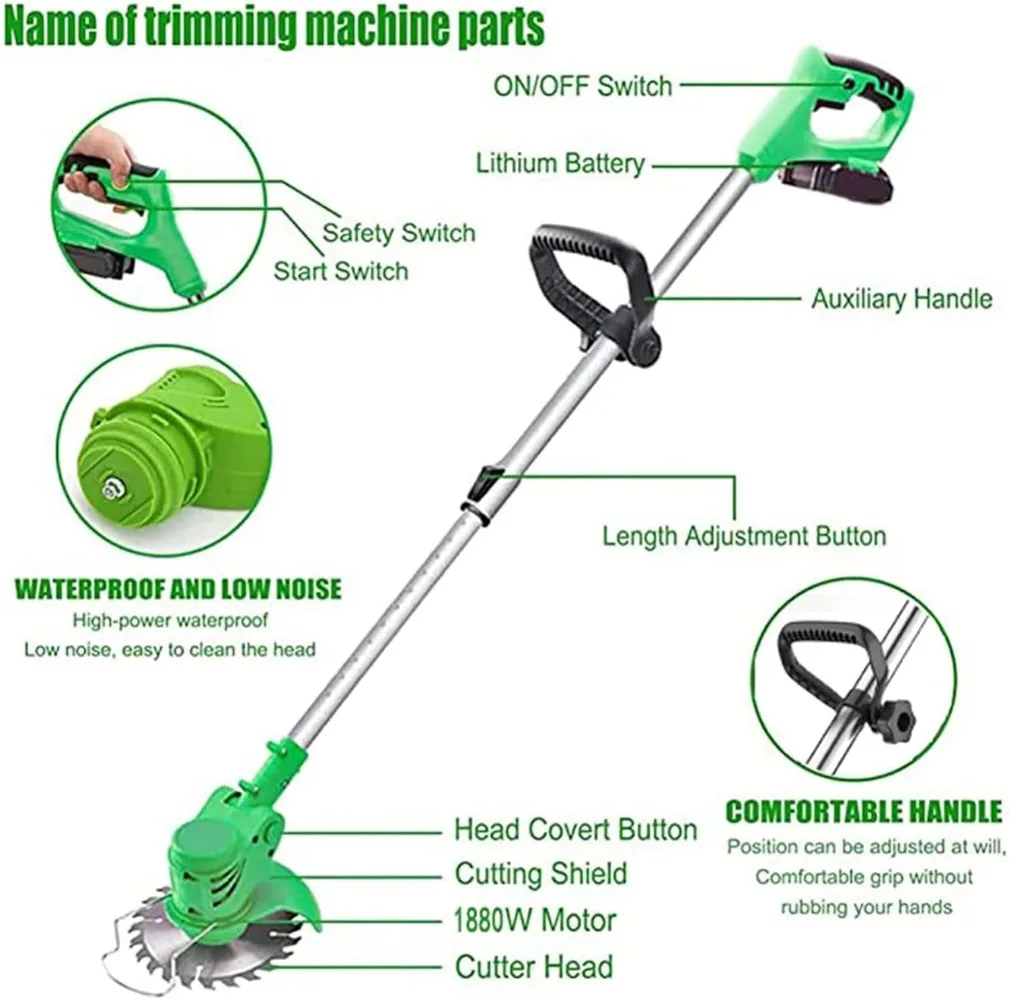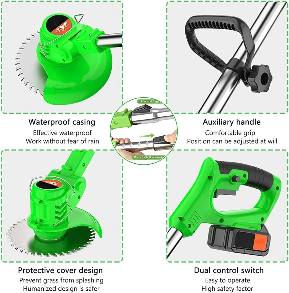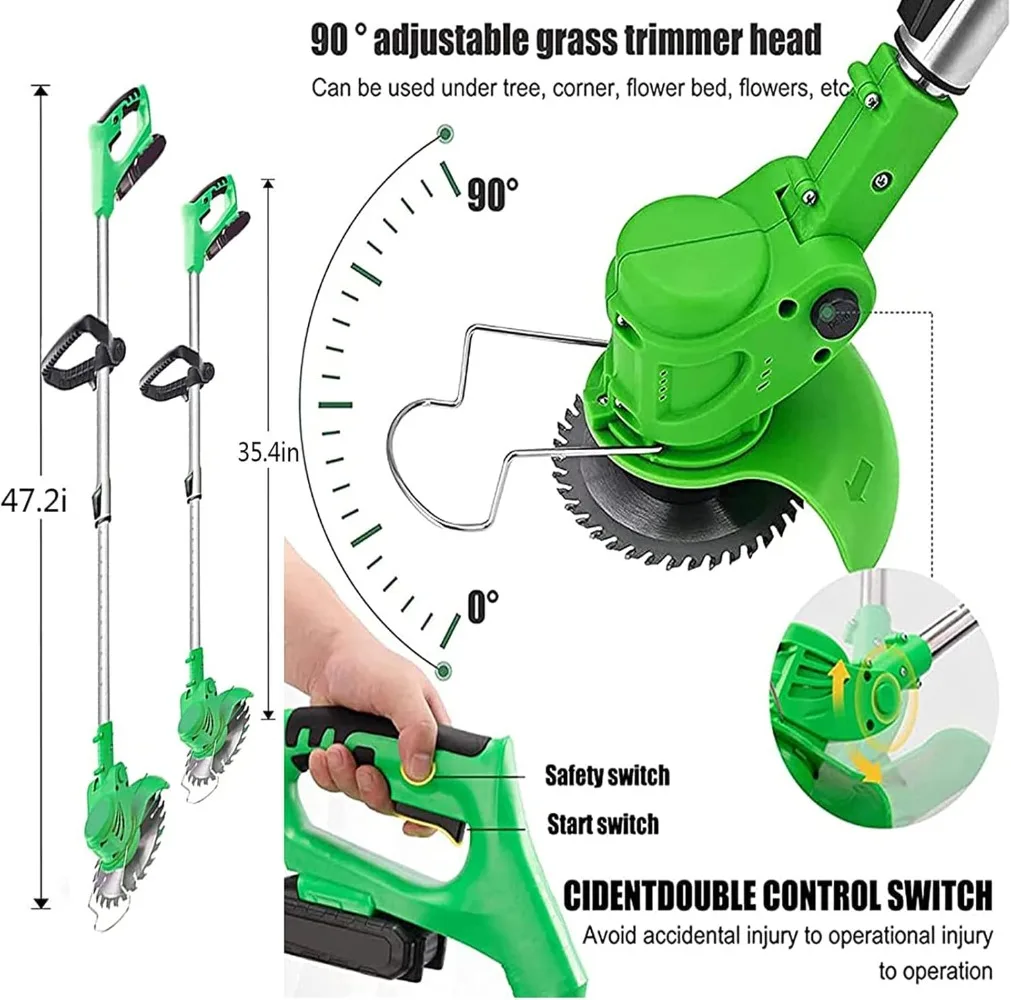 - 【Combination of Three Blade Types】:Cordless String Trimmer manganese steel circular saw blades are suitable Pruning thicker shrub branches, weeds and small shrubs. stainless steel metal blades are suitable for mowing lawns. plastic blades are suitable for mowing soft grass, easy to clean and not rusty.high strength coated and hardened blades that will pruning leaves without any effort.