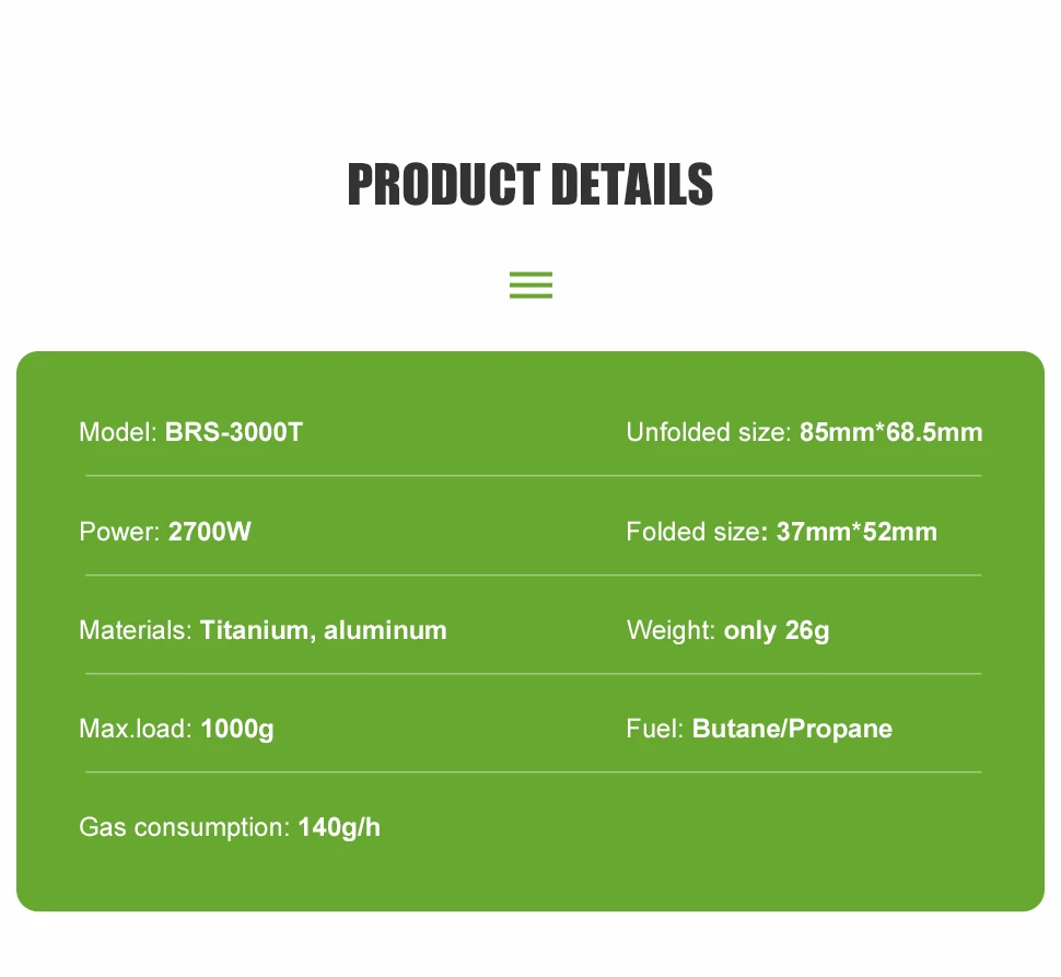 [Lightweight] BRS Stove 3000T is extremely lightweight. It only weighs 26gand extremely compact. It comes in a little bright green pouch that is highly visible on almost any surface.