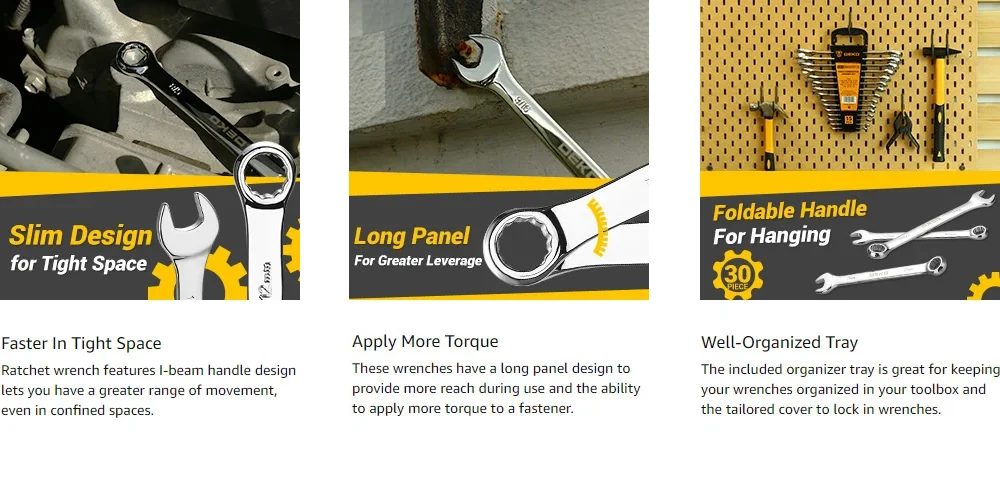 WIDE APPLICATION: This ratcheting wrench set set contains an assortment of tools needed for most repair projects. Flexibly used in auto repair and maintenance, mechanic repair, pipeline repair and electrician repair.