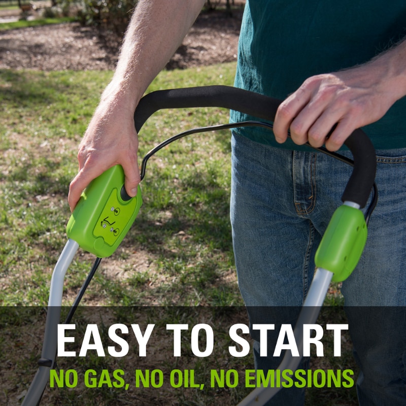 - Cushioned over-mold grip and bale switch for operator comfort