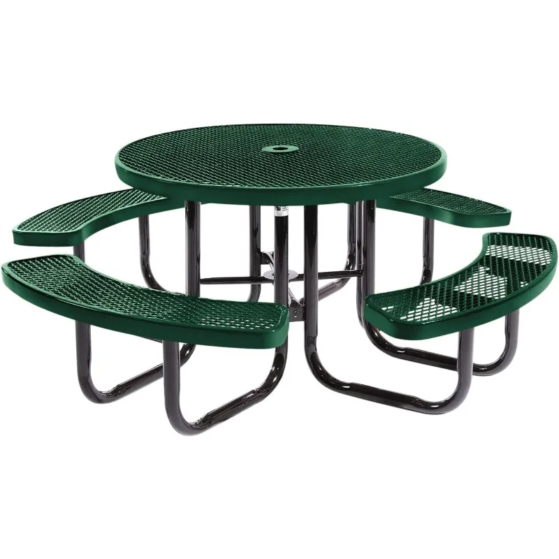 Heavy-Duty Portable Outdoor Picnic Table with Umbrella Hole, Expanded Metal Commercial-Grade Patio Dining Furniture Made in America (46″ Round Top, Textured Green)