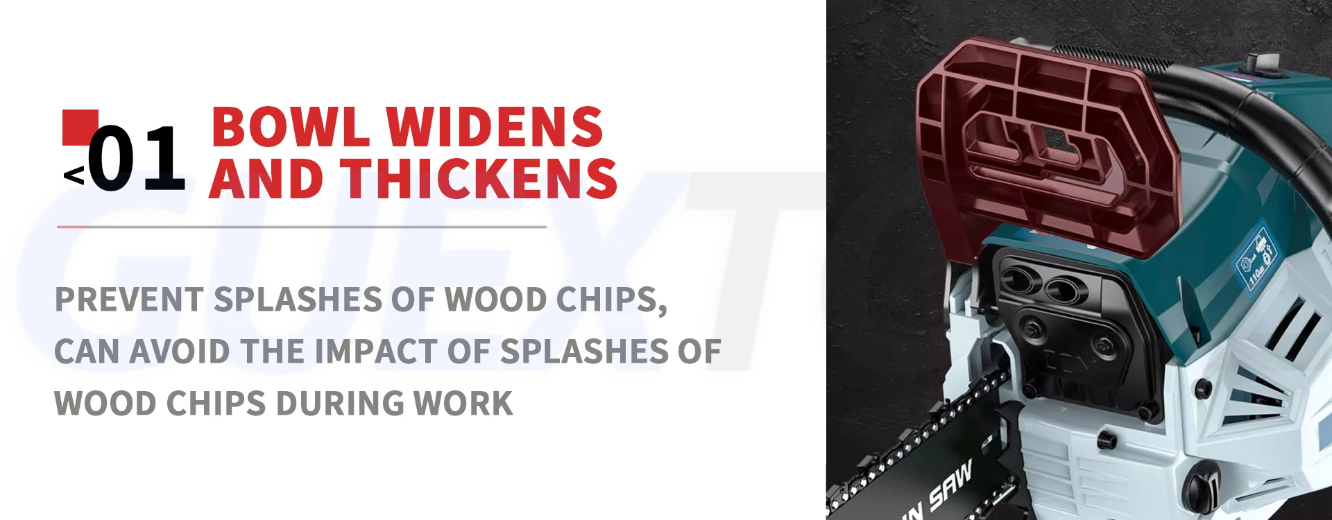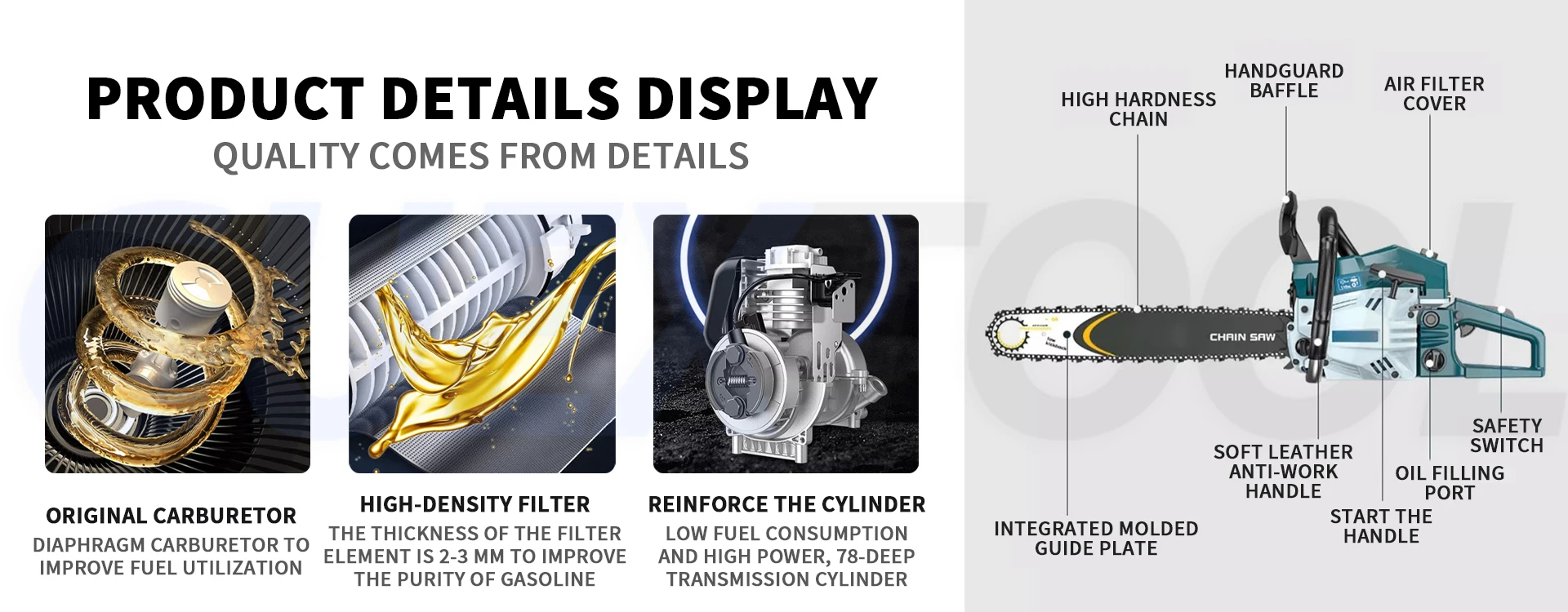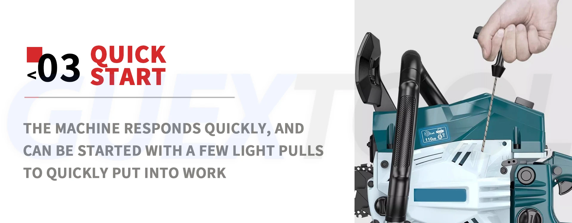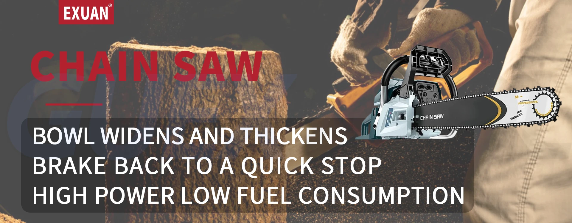 EXUAN chain saw can quickly cut materials such as wood and branches. Compared to traditional manual saws, chain saws can complete a large amount of cutting work in a short period of time, greatly improving work efficiency. Fast cutting speed can reduce material deformation and damage during the cutting process, and improve cutting quality.