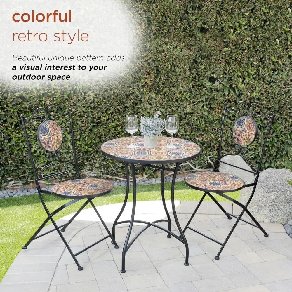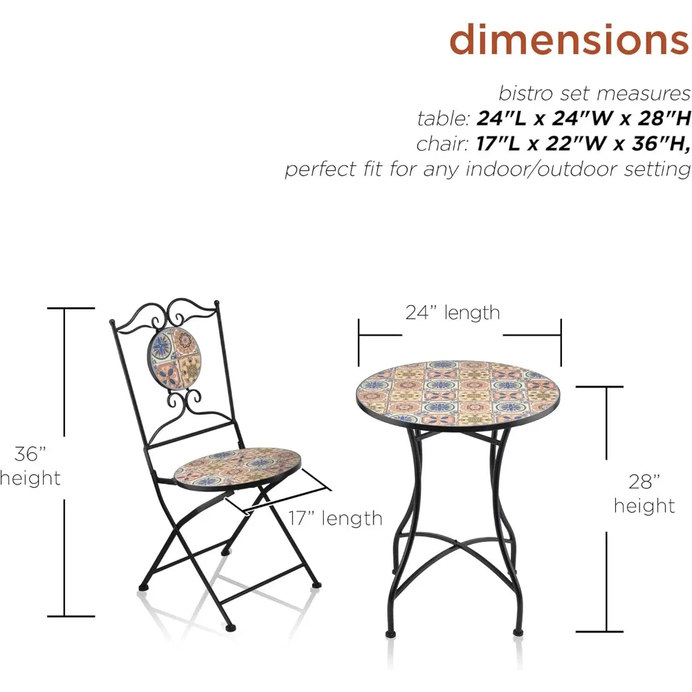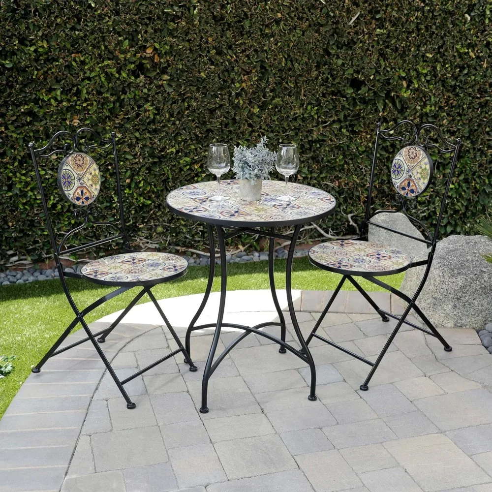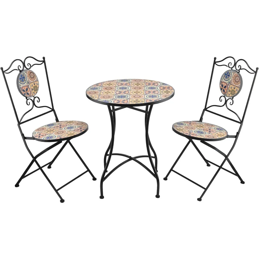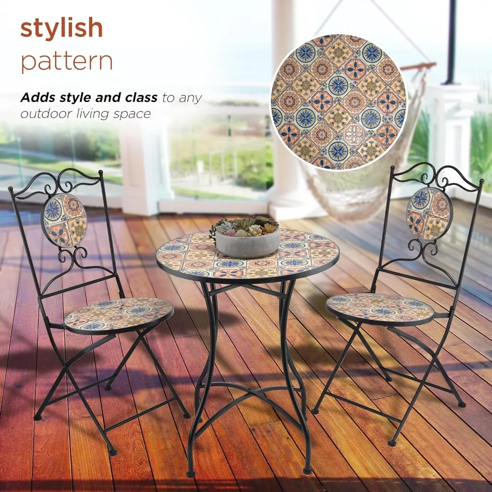 - FLORAL TILE DESIGN PATIO SEATING SET: Unique tabletop and 2 chairs with a Mediterranean tile design adorn this iron 3-piece bistro set, and provides convenient seating to your indoor or outdoor living space or yard