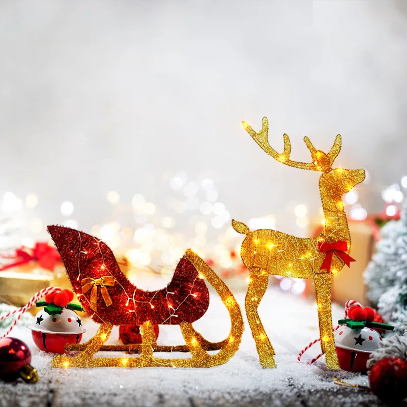 1 SET: Light up your front yard and celebrate the winter months with a glowing reindeer pulling Santa's sleigh