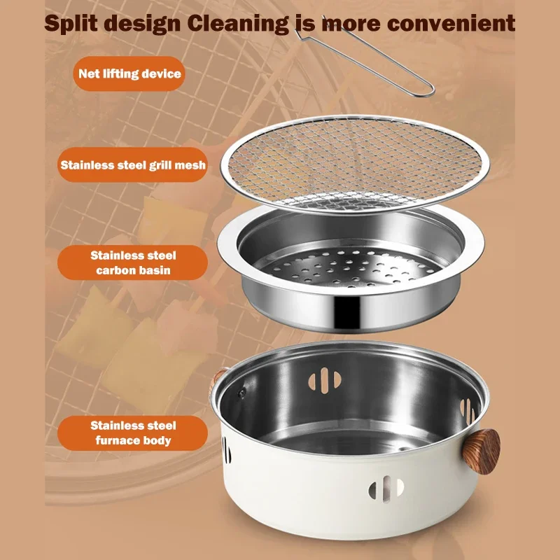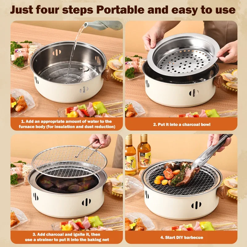 Portable and easy to use, just four steps: 1. Add an appropriate amount of water to the furnace body (to insulate and reduce dust) 2. Place it in a charcoal basin