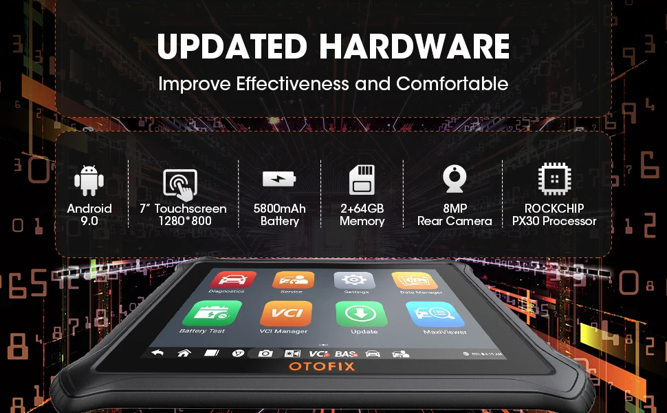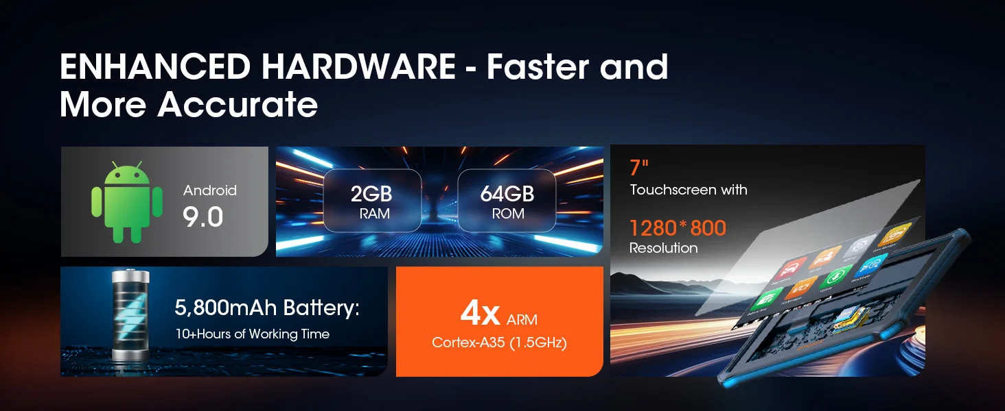 Level-up Hardware Settings – Offer a fast operation speed and a quick diagnosis benefiting from superior specifications: Android 9, 4-Core Cortex-A35, 7''-1280*800 Touchscreen, 2G+64G Memory, 5800mAh Battery, etc.