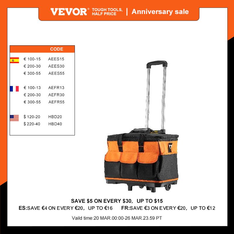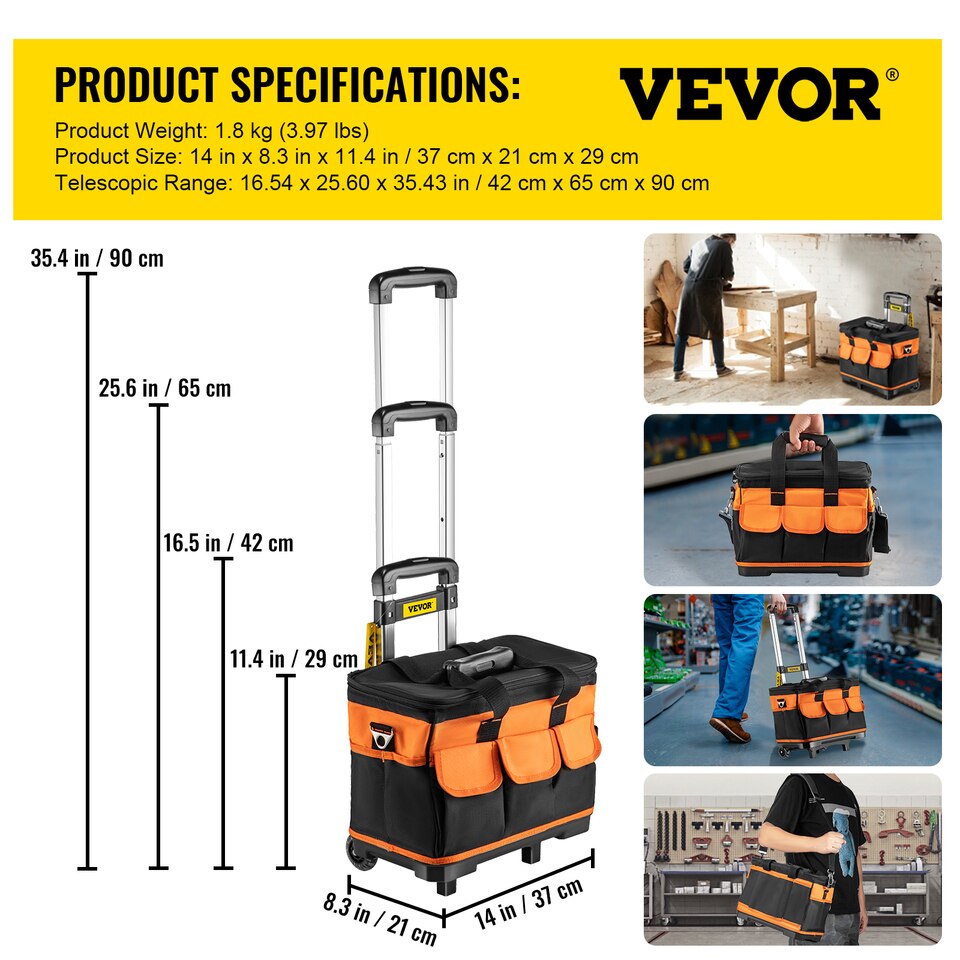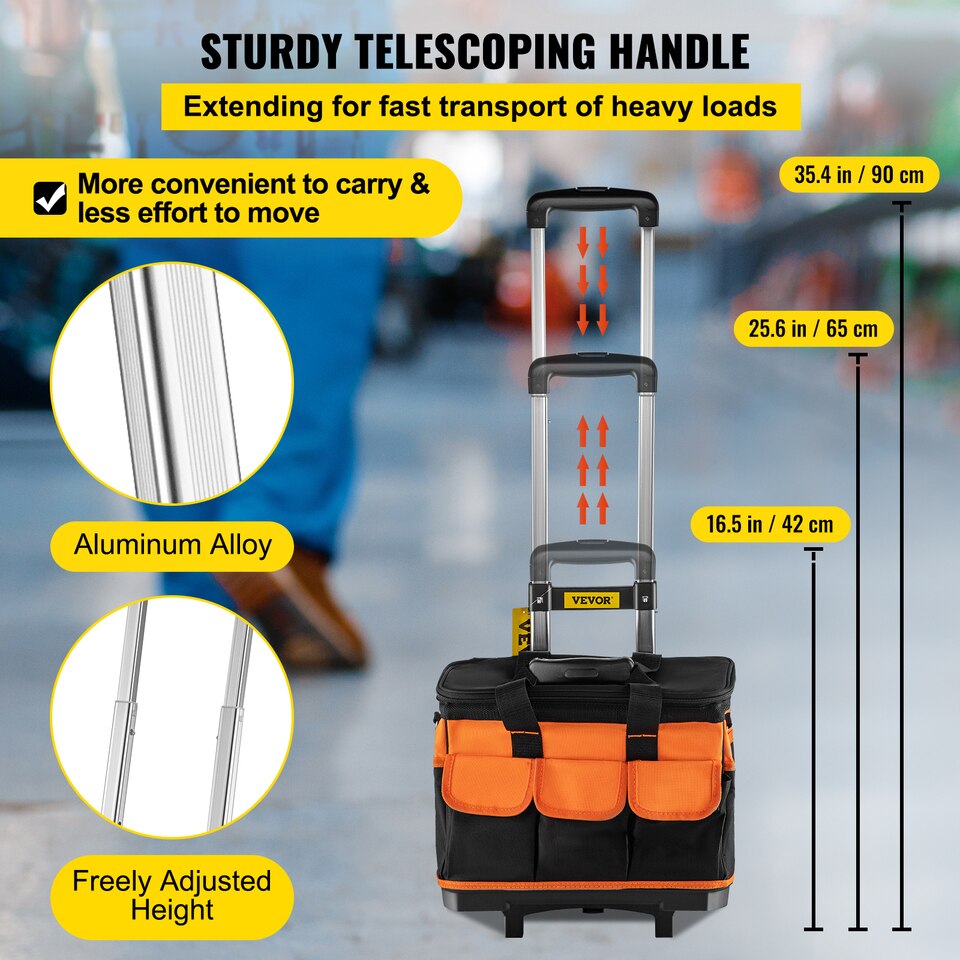 Our tools bag has 17 pockets to hold your favorite hand tools. This tool bag organizer is the perfect tool for saving you the trip when you need your tools. The large main compartments provide abundant storage space for tools and compact power equipment. In addition, it is equipped with a heavy-duty telescoping handle and wheels that allow easy mobility.