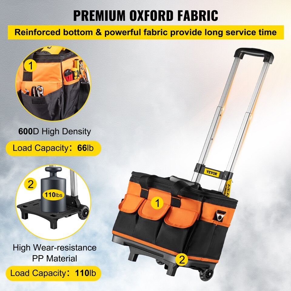 • Enhanced Load Capacity: 66lb load capacity of the sturdy bag and 110lb load capacity of the reinforced bottom. Our rolling tool tote bag is suitable for heavy duty tools.