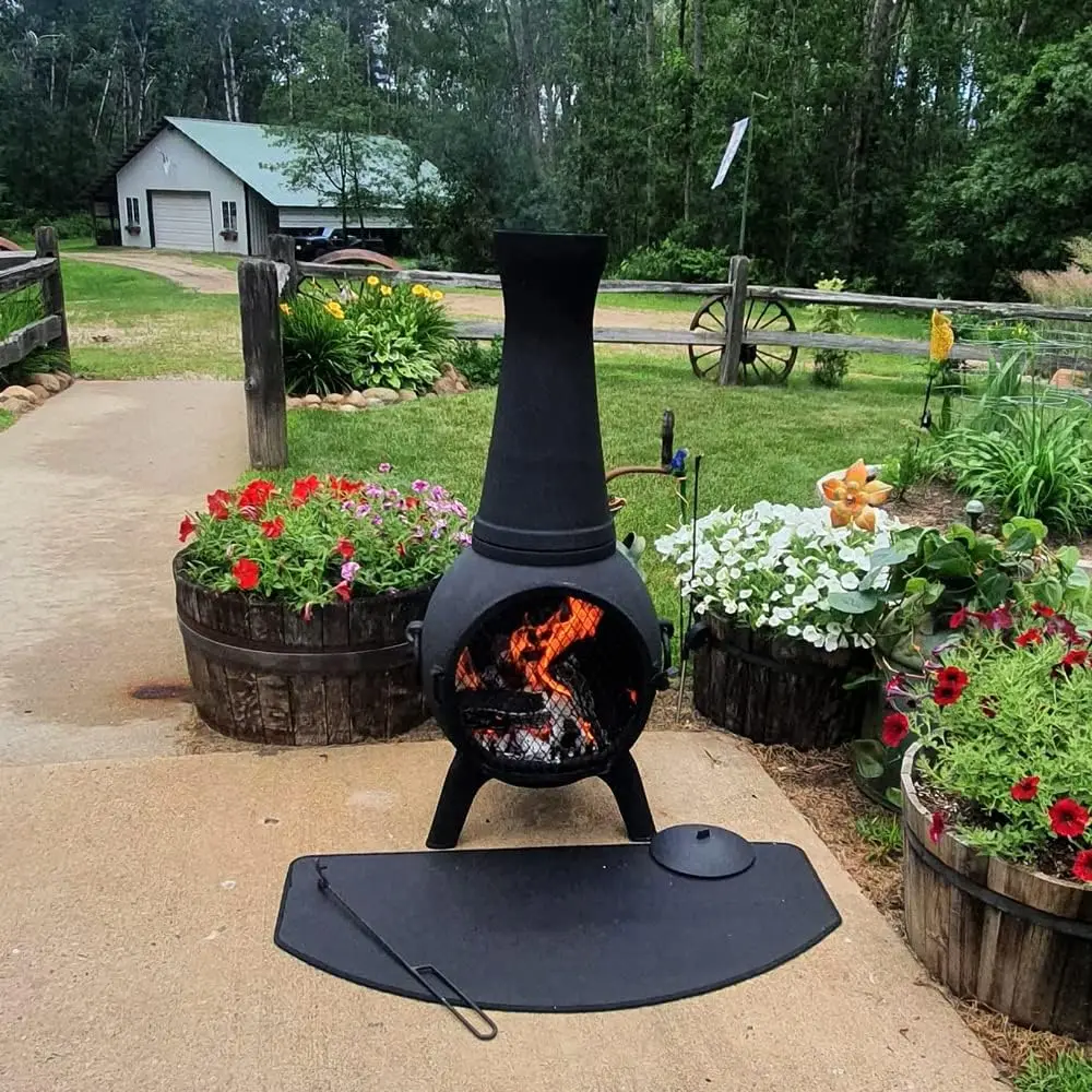 The Prairie Fire Chiminea has a large mouth opening for full view of the fire, handles fire logs 12″-14″ larger logs can be placed vertically. Hinged safety door provides easy access for adding wood and roasting marshmallows. Efficient drafting design also ensures the cleanest burning fire to get the most from your firewood with little ash left over. Efficient burning means much less cleaning than fire bowls or fire pits.