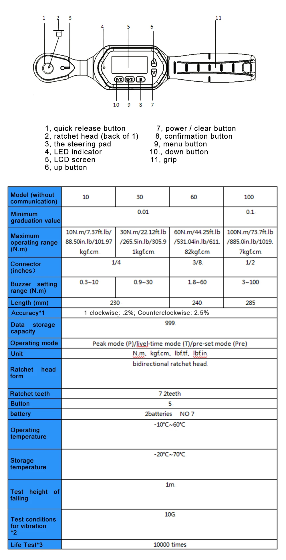4.The buzzer and LED can be triggered when indication reaches a predetermined torque value (limited to peak mode);