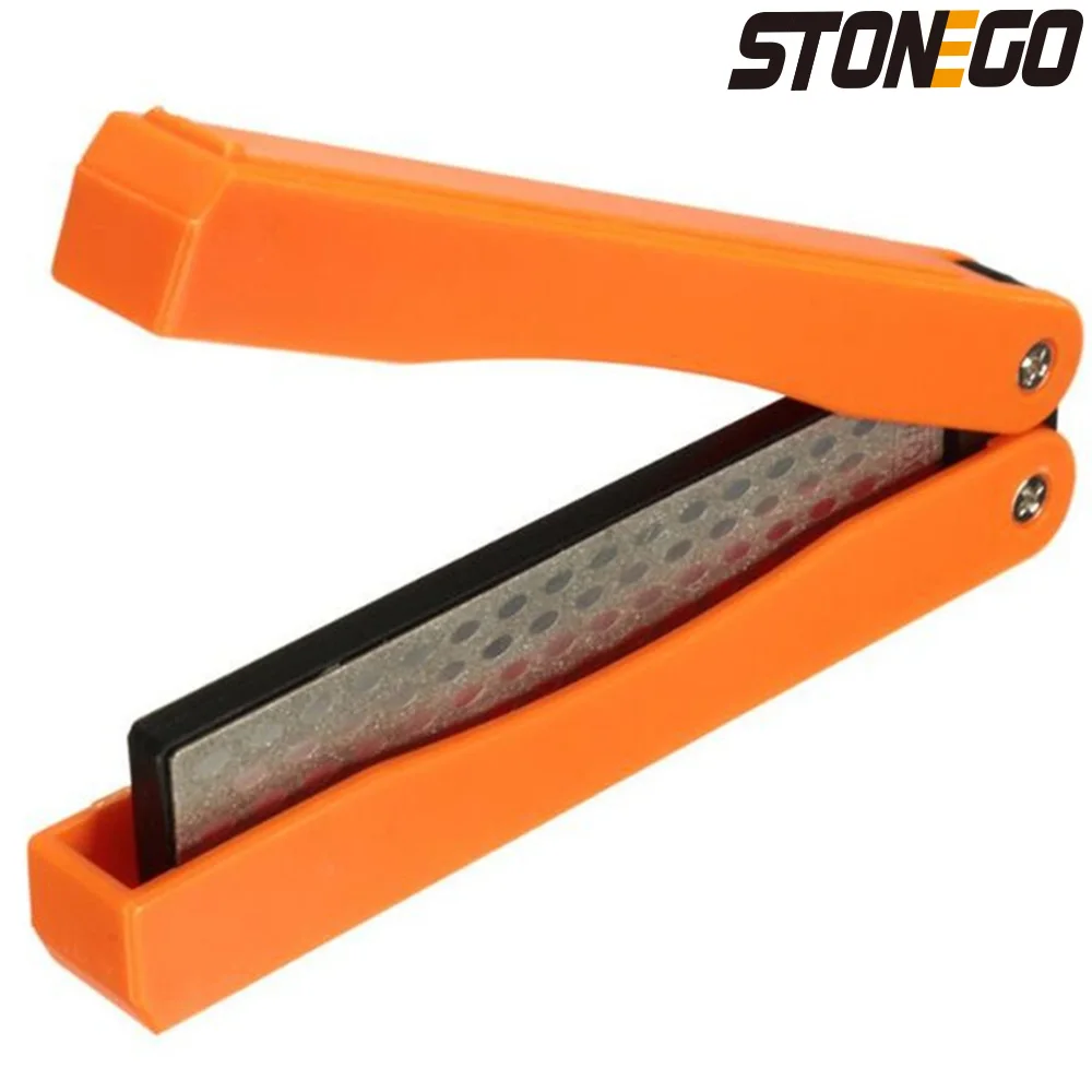 UNIQUE PORTABLE FOLDING DESIGN:Sharpening surface is honeycomb,so it can sharpen faster and more efficient than the oval-shaped sharpening surface. Stripe is on the handle which can play a important role in anti-skid. The design of concave and convex combining on the tail end of handle prevents handle dislocation when you use it, and avoids folder your fingers. The fan-shaped and folding construction provides great protection to the stones, preventing from damage.