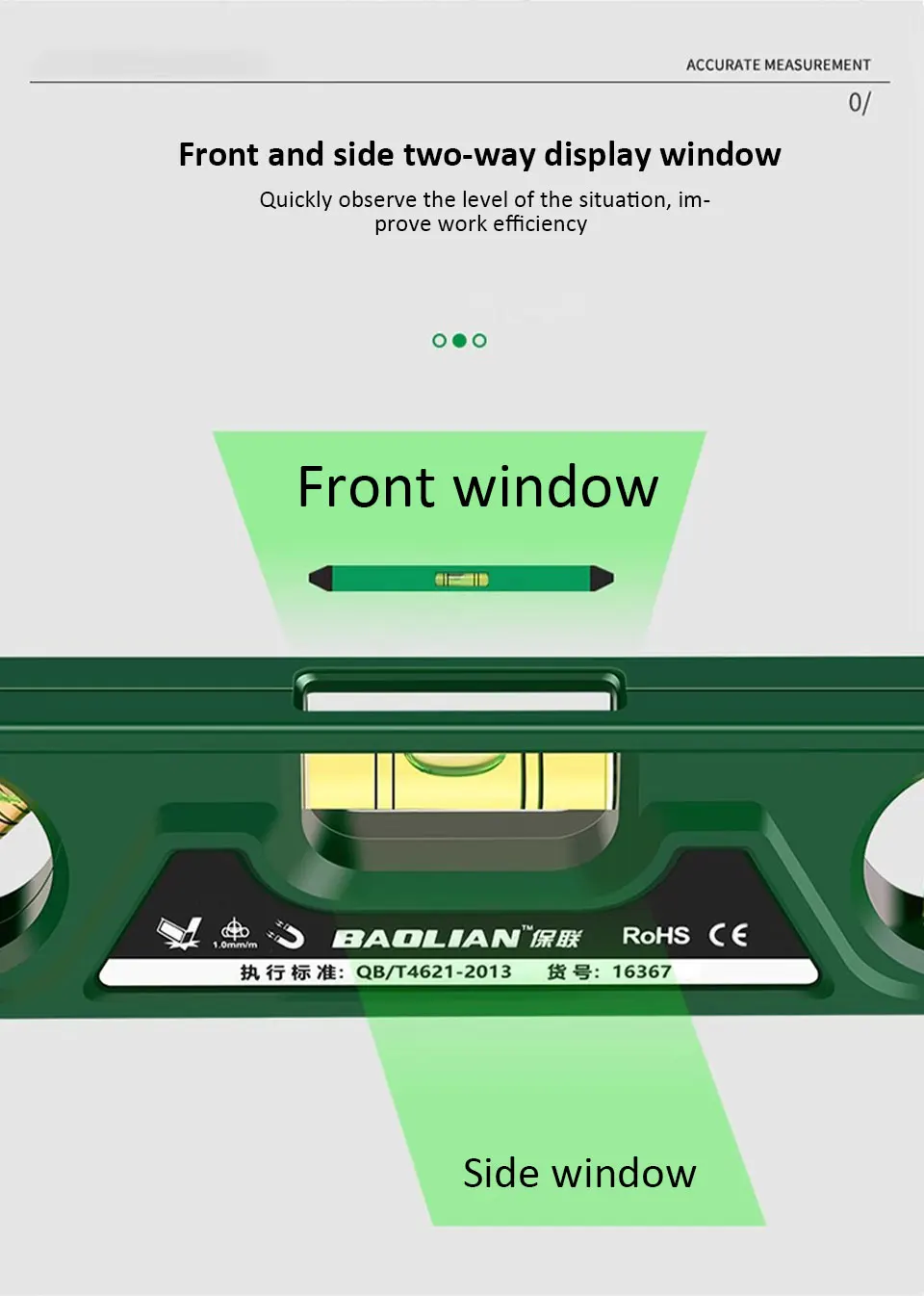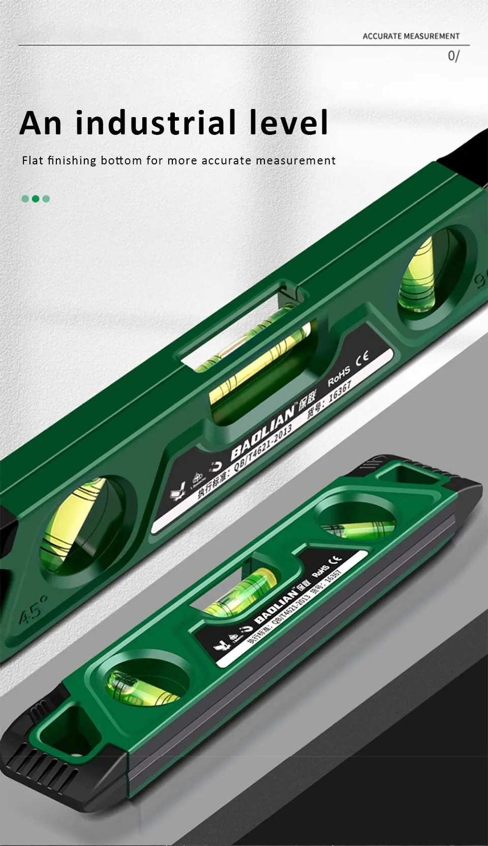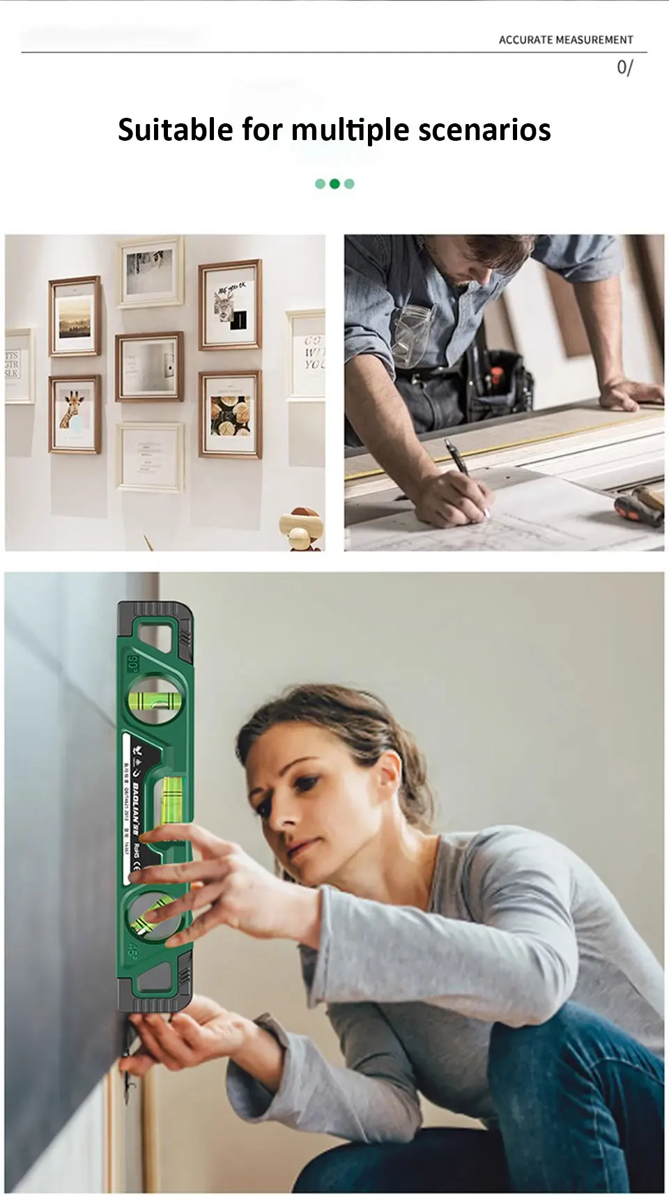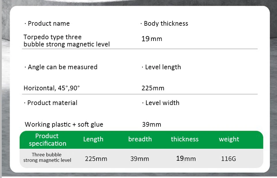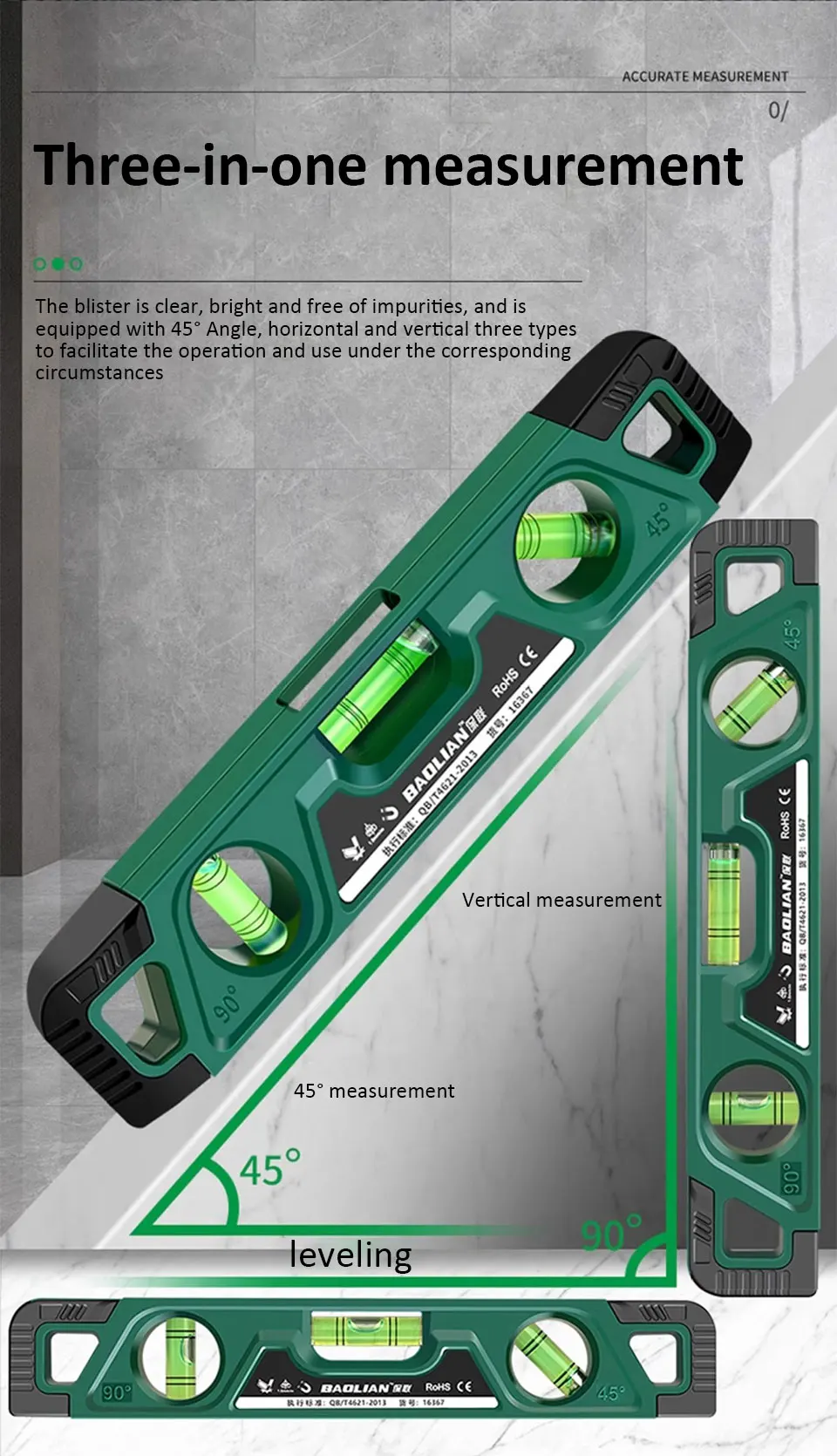 ●3 in1 measurement: equipped with three types of bubbles: 45 ° angle, horizontal, and vertical, for easy operation and use in corresponding situations.