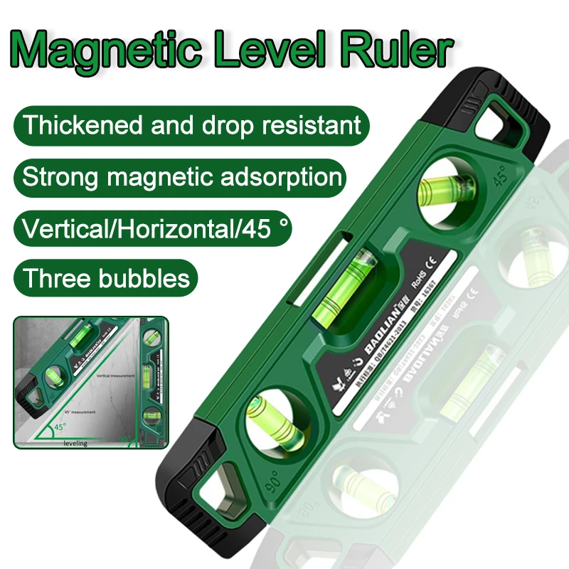 Three Bubble Mini Magnetic Level Ruler High-Precision Horizontality Gauge 0° /45° /90° 225MM Shockproof Measuring Level Gauge