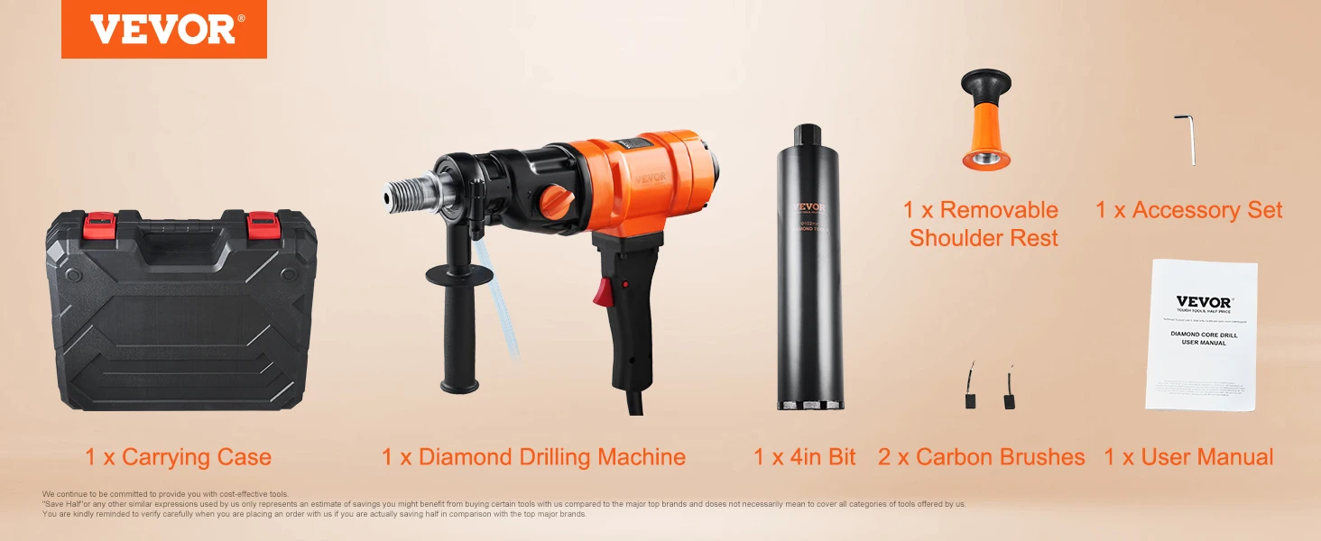 4-inch Wet Drilling: Our lightweight handheld core drilling machine can perform wet drilling, and you can feel assured of accuracy when boring holes in a variety of surfaces with a 3.1-4 in / 8-10.2 cm diameter hole capacity. More importantly, a industrial-grade 4in core bit with 1-1/4" thread is thoughtfully included.