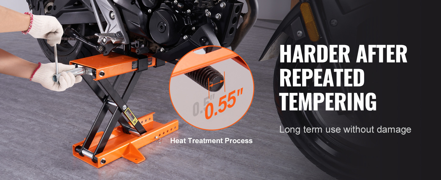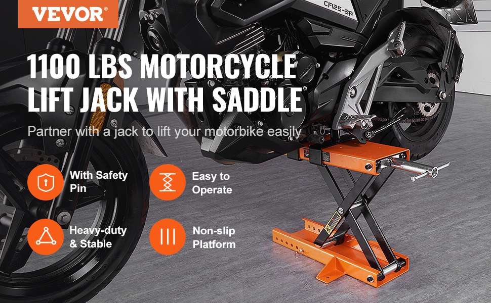 Large Weight-bearing Capacity: When you need to lift your motorcycle for maintenance and cleaning, you can partner with a VEVOR motorcycle scissor lift jack. Through the load-bearing tests, the motorcycle lift jack can securely hold up to 1100 lbs/0.5 tons. The motorcycle center jack is a great helper in your garage to lift your street bikes, cruiser bikes, and adventure touring motorcycles.